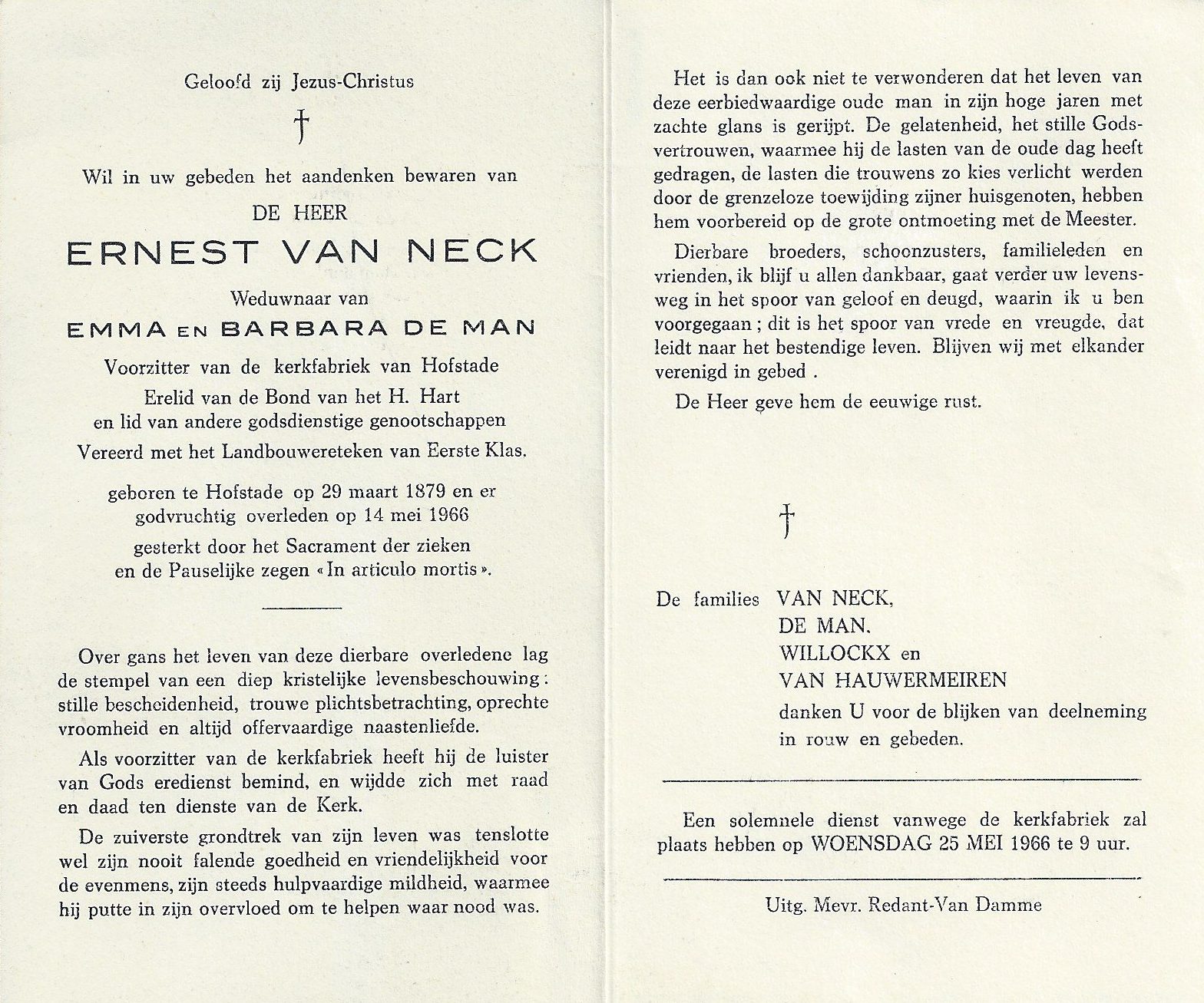 Ernest Van Neck Geboren: 29 maart 1879 — Hofstade Overleden: 14 mei 1966 — Hofstade |