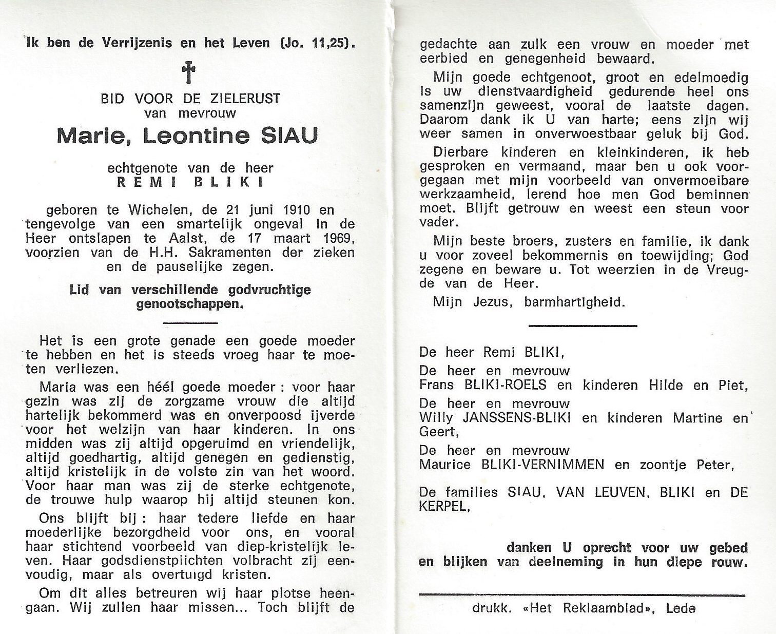 Marie Leontine Siau Geboren: 21 juni 1910 33 29 — Wichelen Overleden: 17 maart 1969 — Aalst |