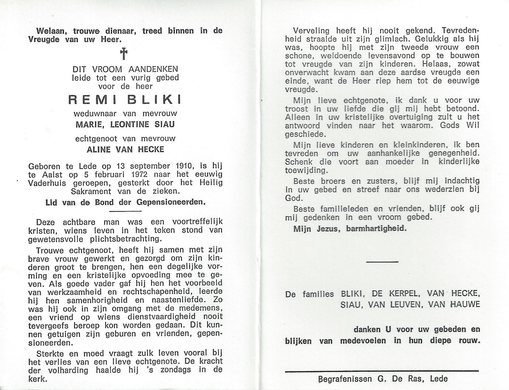 Remi Bliki Geboren: 13 september 1910 — Lede Overleden: 5 februari 1972 — Aalst |