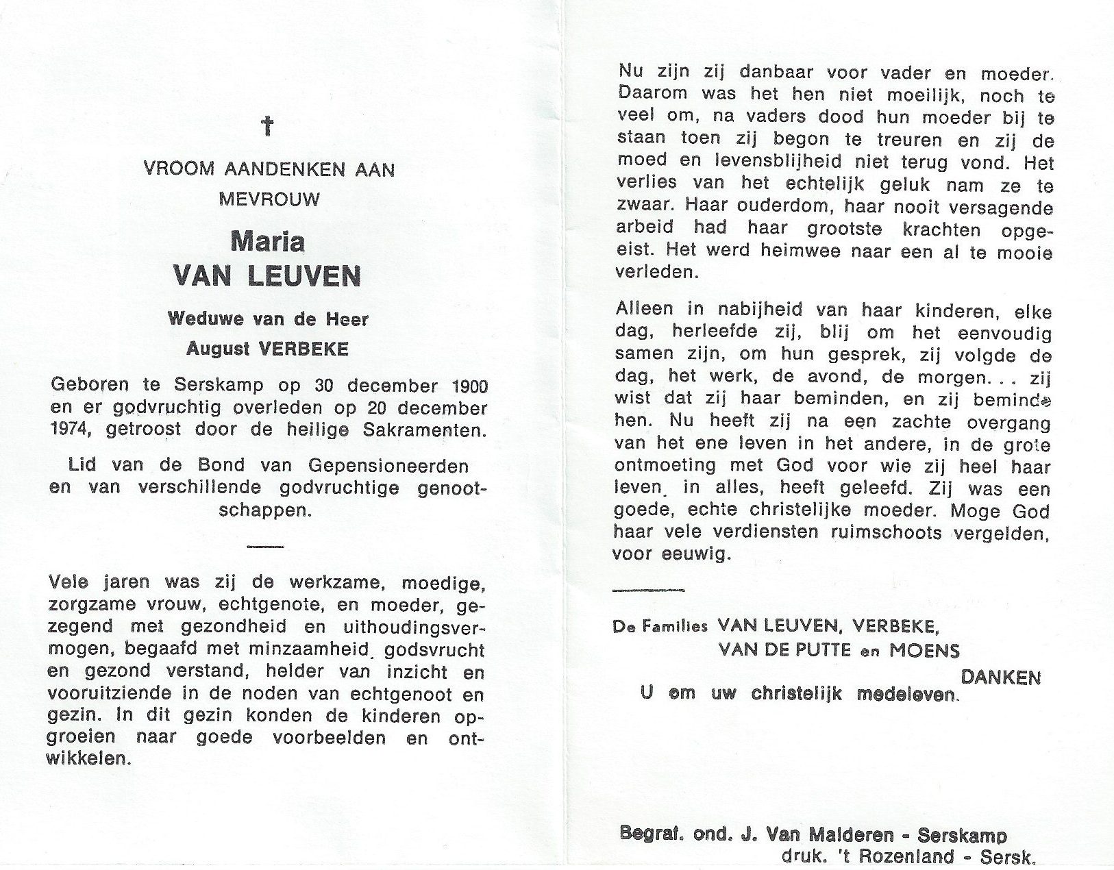 Maria Ludovica Van Leuven Geboren: 30 december 1900 47 45 — Serskamp Overleden: 20 december 1974 — Serskamp |