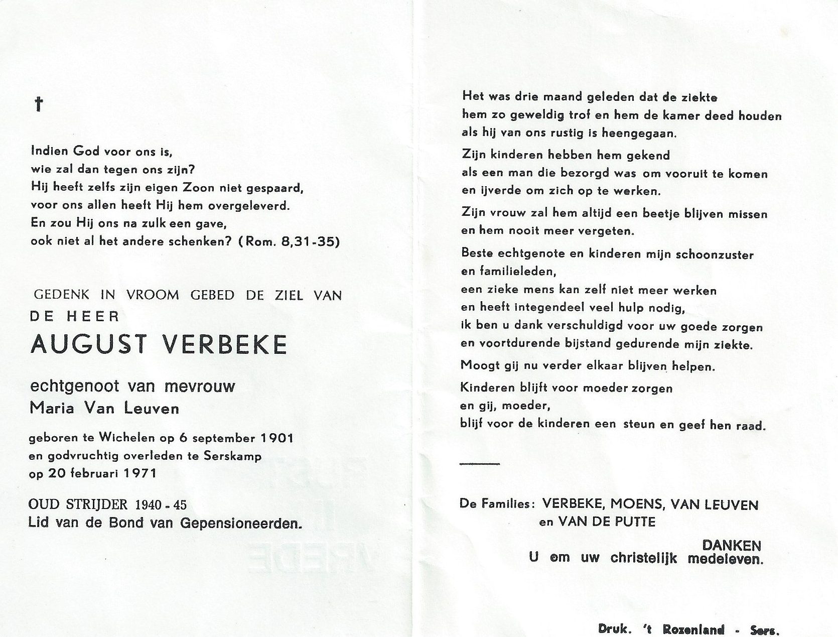 Overlijden van een broer | August Verbeke 20 februari 1971 |
