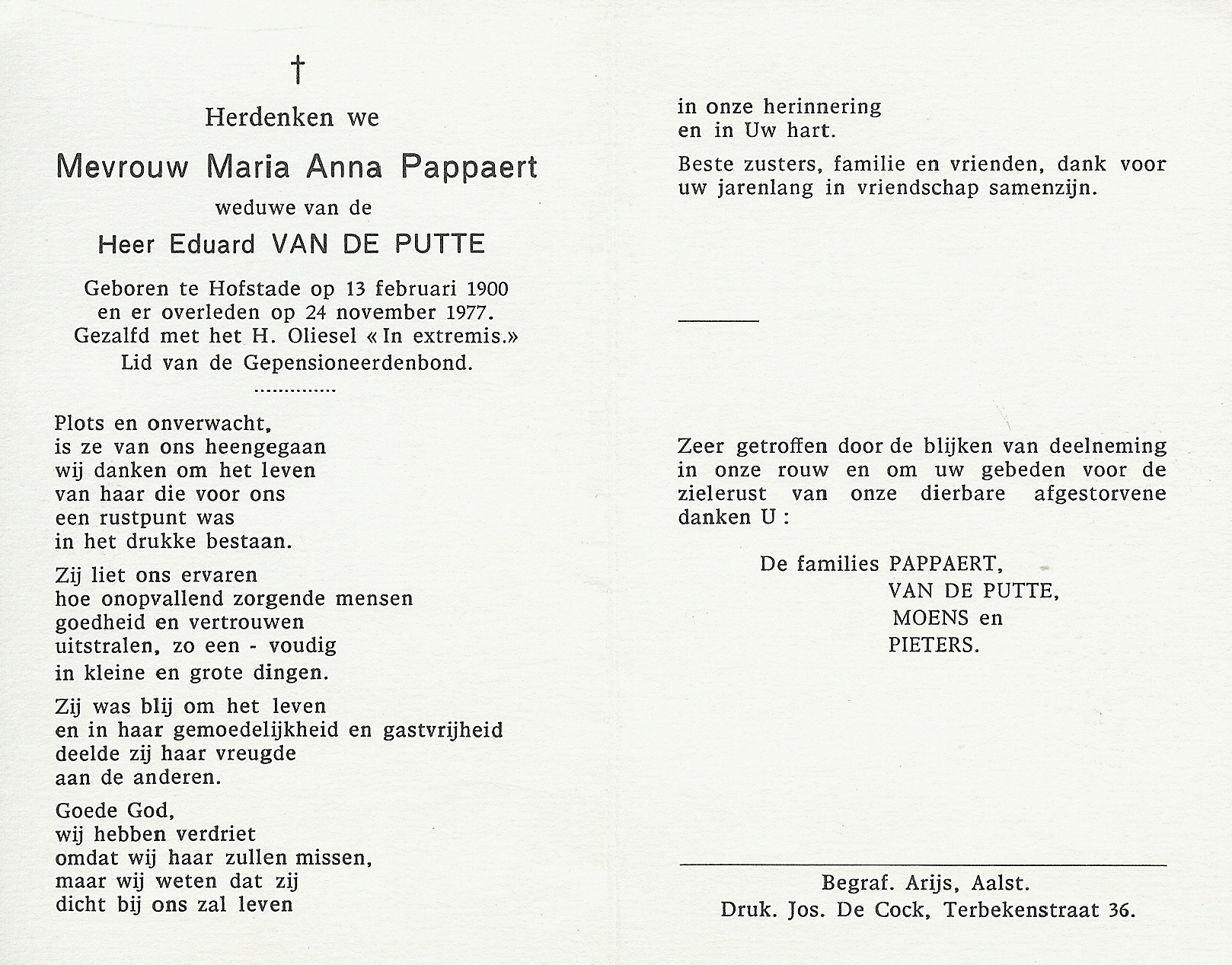 Maria Anna Pappaert Geboren: 13 februari 1900 — Hofstade Overleden: 24 november 1977 — Hofstade |