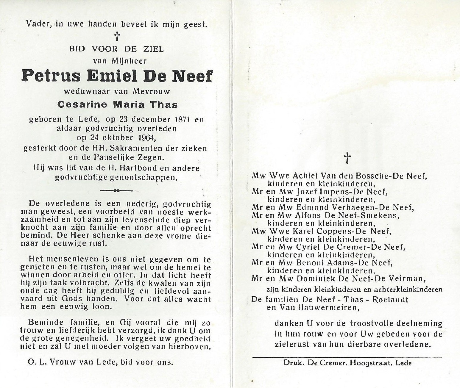 Overlijden van een broer | Petrus Emiel De Neef 24 oktober 1964 (Leeftijd 90 jaar) |