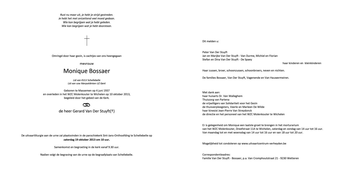 Monique Maria Bossaer Geboren: 4 juni 1937 — Massemen Overleden: 10 oktober 2013 — Wichelen |