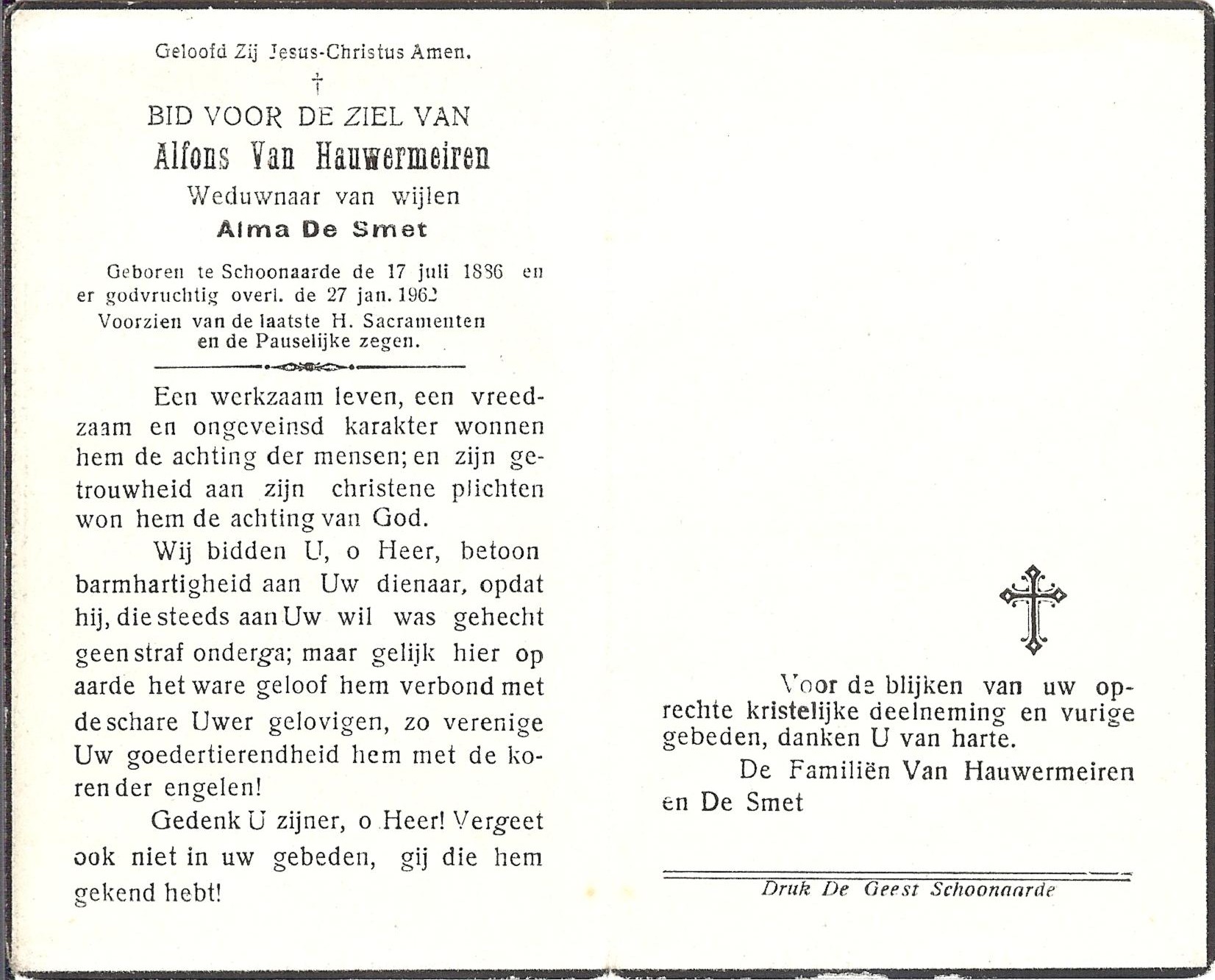 Alphonsus Van Hauwermeiren Geboren: 17 juli 1886 46 40 — Schoonaarde Overleden: 27 januari 1962 — Schoonaarde |