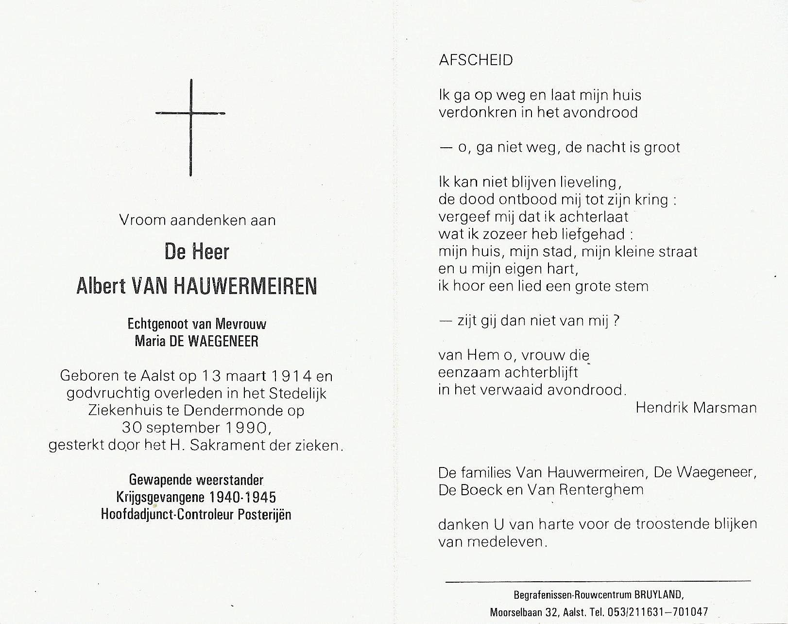 Albert Van Hauwermeiren Geboren: 13 maart 1914 41 32 — Aalst Overleden: 30 september 1990 — Dendermonde |