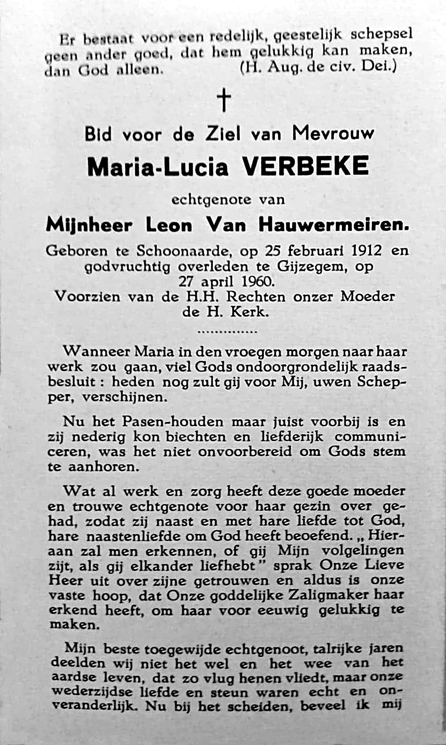 Maria Lucia Verbeke Geboren: 25 februari 1912 — Schoonaarde Overleden: 27 april 1960 — Gijzegem |