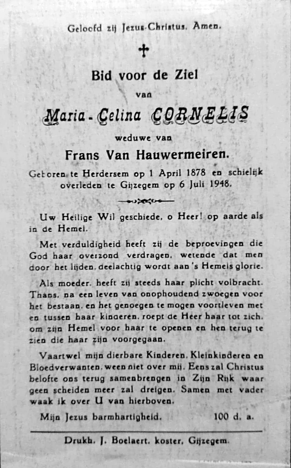Maria Celina Cornelis Geboren: 1 april 1878 — Herdersem Overleden: 6 juli 1948 — Gijzegem |