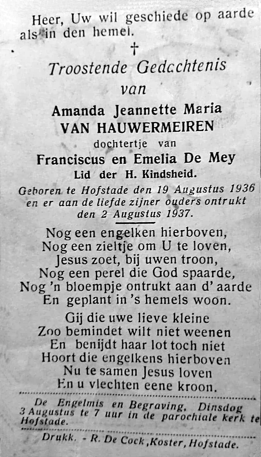 Begrafenis van een kleindochter | Amanda Jeanette Maria Van Hauwermeiren 3 augustus 1937 (Leeftijd 59 jaar) |