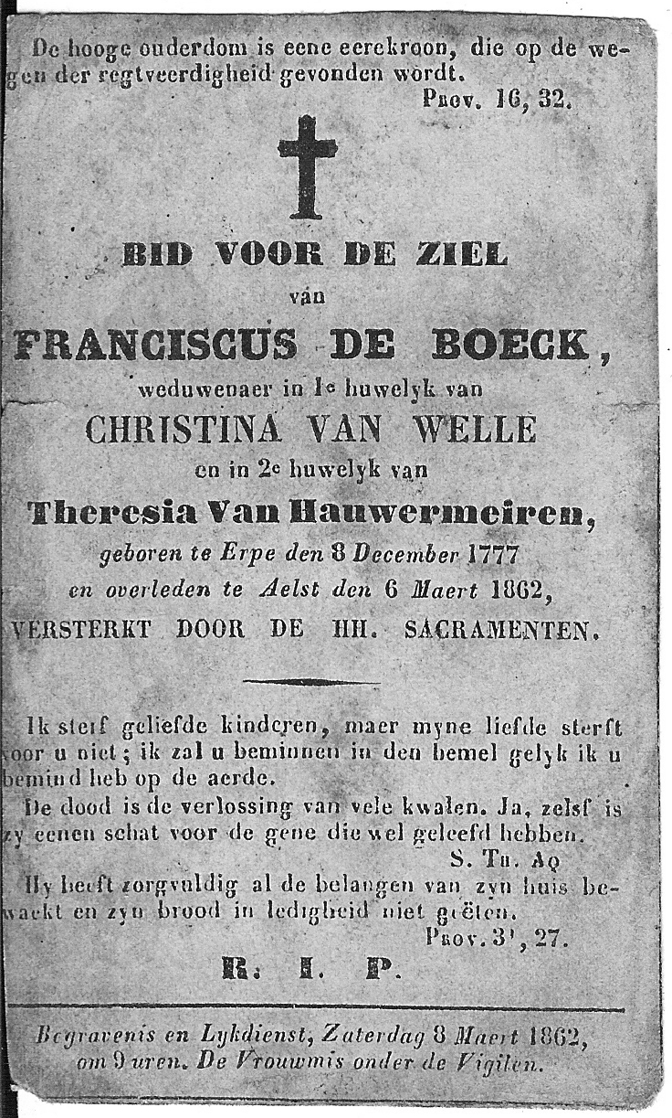 Joannes Franciscus De Boeck Geboren: 8 december 1777 — Erpe Overleden: 6 maart 1862 — Aalst |