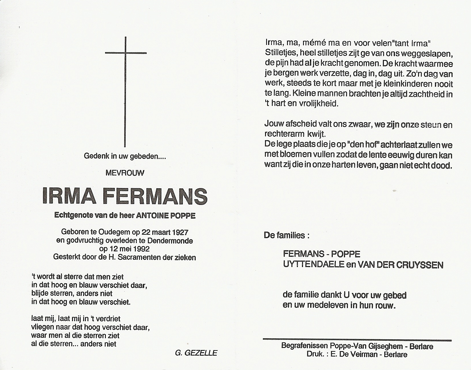 Irma Fermans Geboren: 22 maart 1927 25 24 — Oudegem Overleden: 12 mei 1992 — Dendermonde |