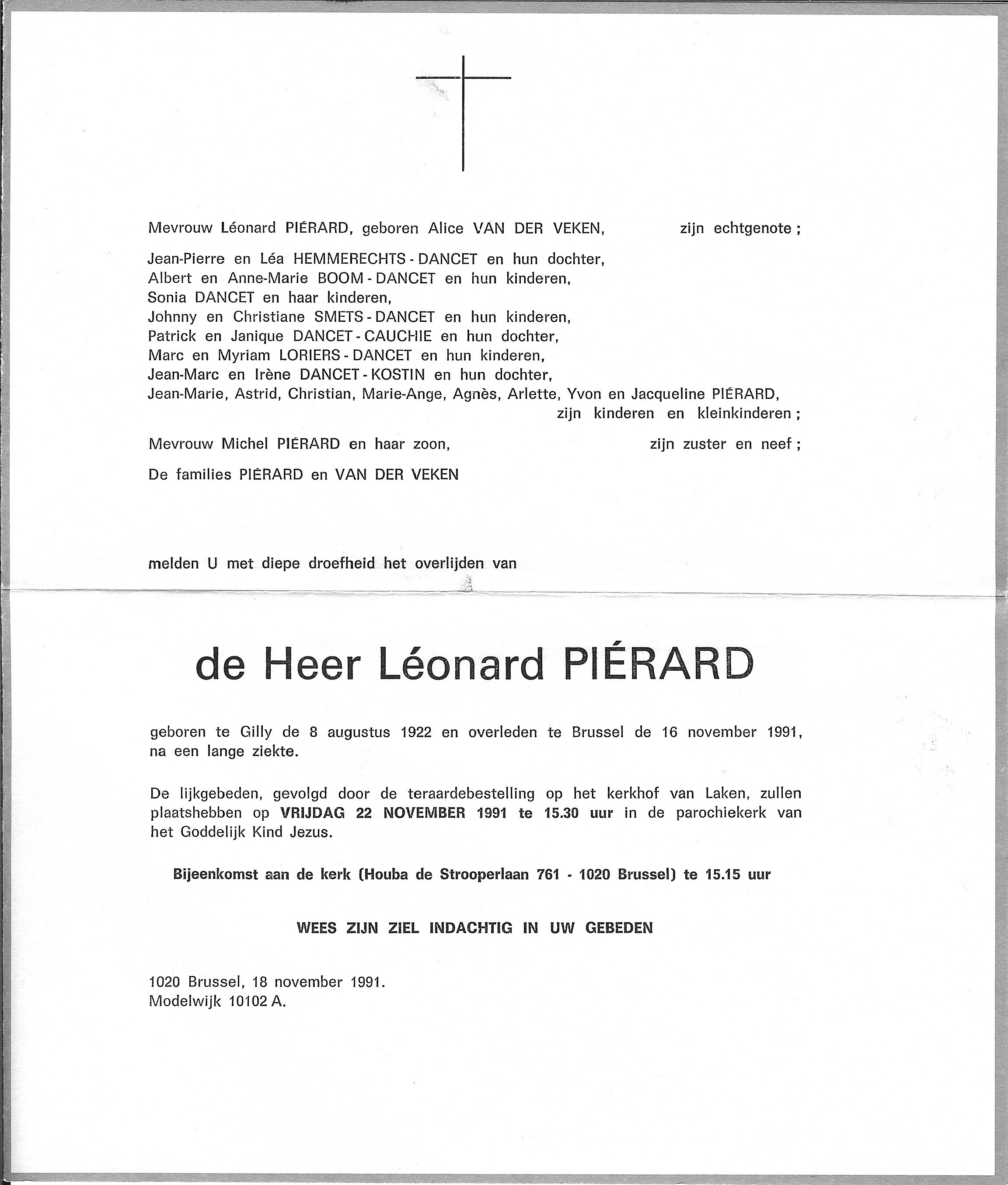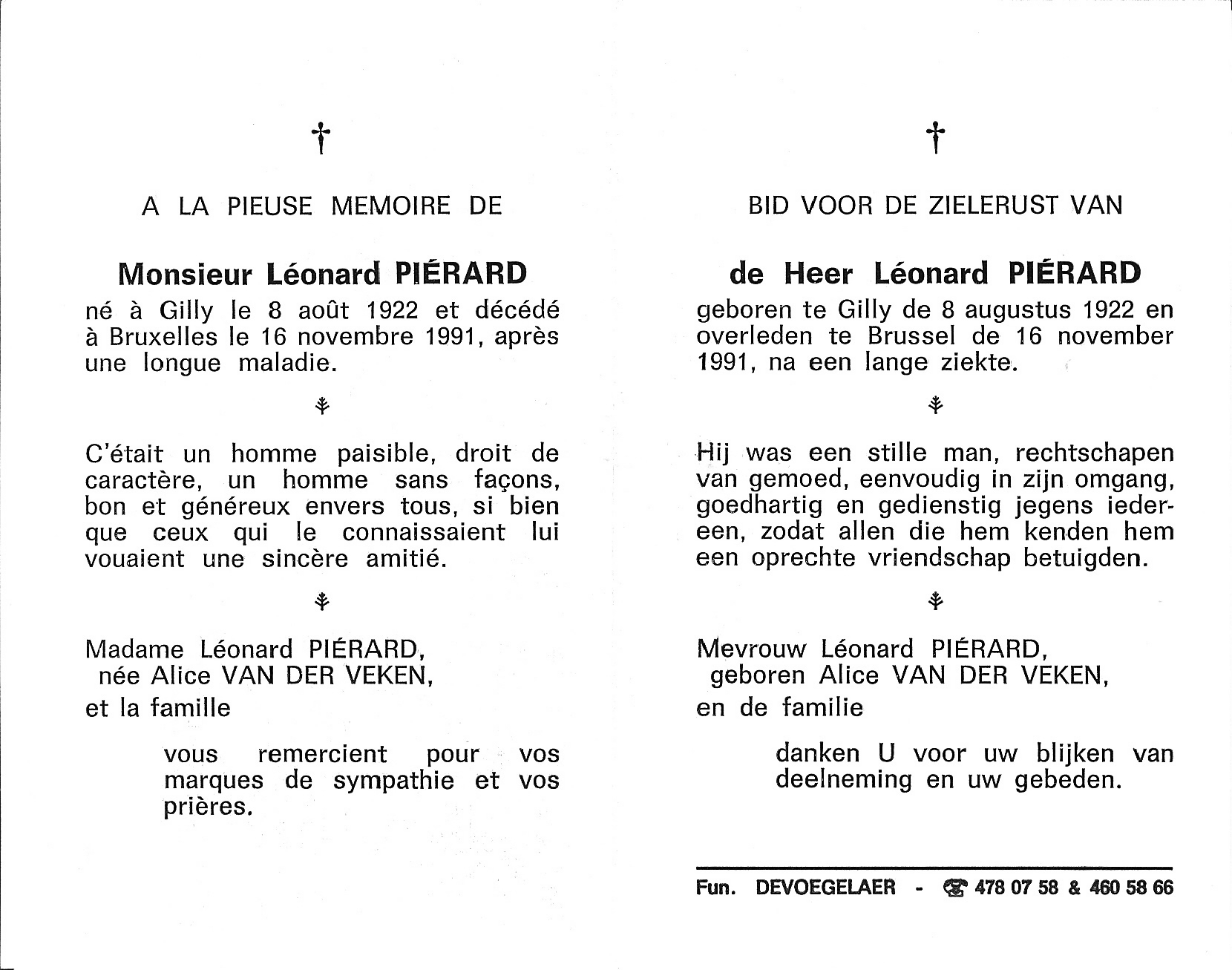 Leonard Pierard Geboren: 8 augustus 1922 — Gilly Overleden: 16 november 1991 — Brussel |
