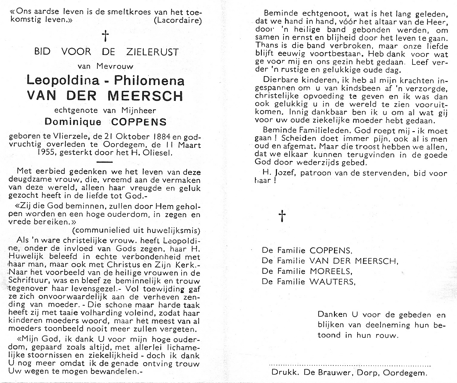 Leopoldina-Philomena Van Der Meersch Geboren: 21 oktober 1884 — Vlierzele Overleden: 11 maart 1955 — Oordegem |