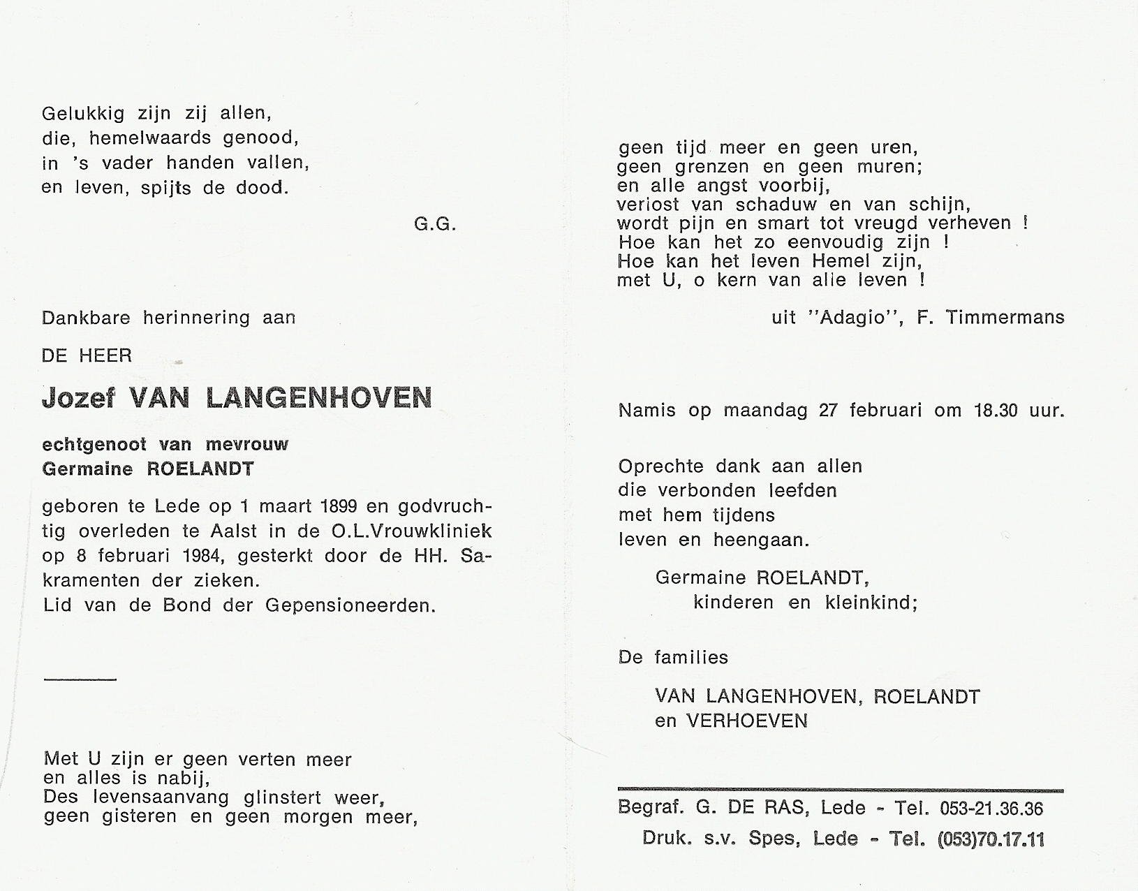 Overlijden van een broer | Carolus Ludovicus Josephus Van Langenhoven 8 februari 1984 (Leeftijd 79 jaar) |