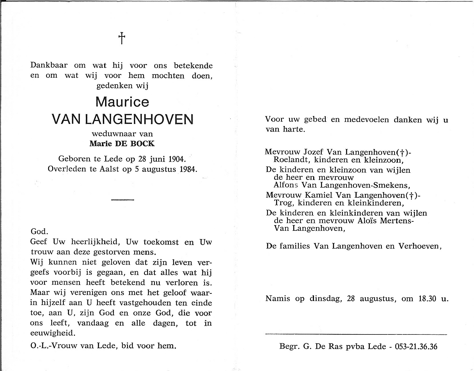 Maurice Van Langenhoven Geboren: 28 juni 1904 38 — Lede Overleden: 5 augustus 1984 — Aalst |