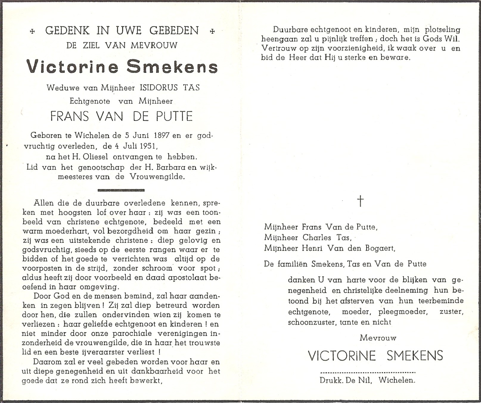 Victorine Smekens Geboren: 5 juni 1897 35 31 — Wichelen Overleden: 4 juli 1951 — Wichelen |