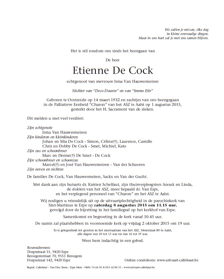 Overlijden van grootvader van vaders kant | Etienne De Cock 1 augustus 2015 |