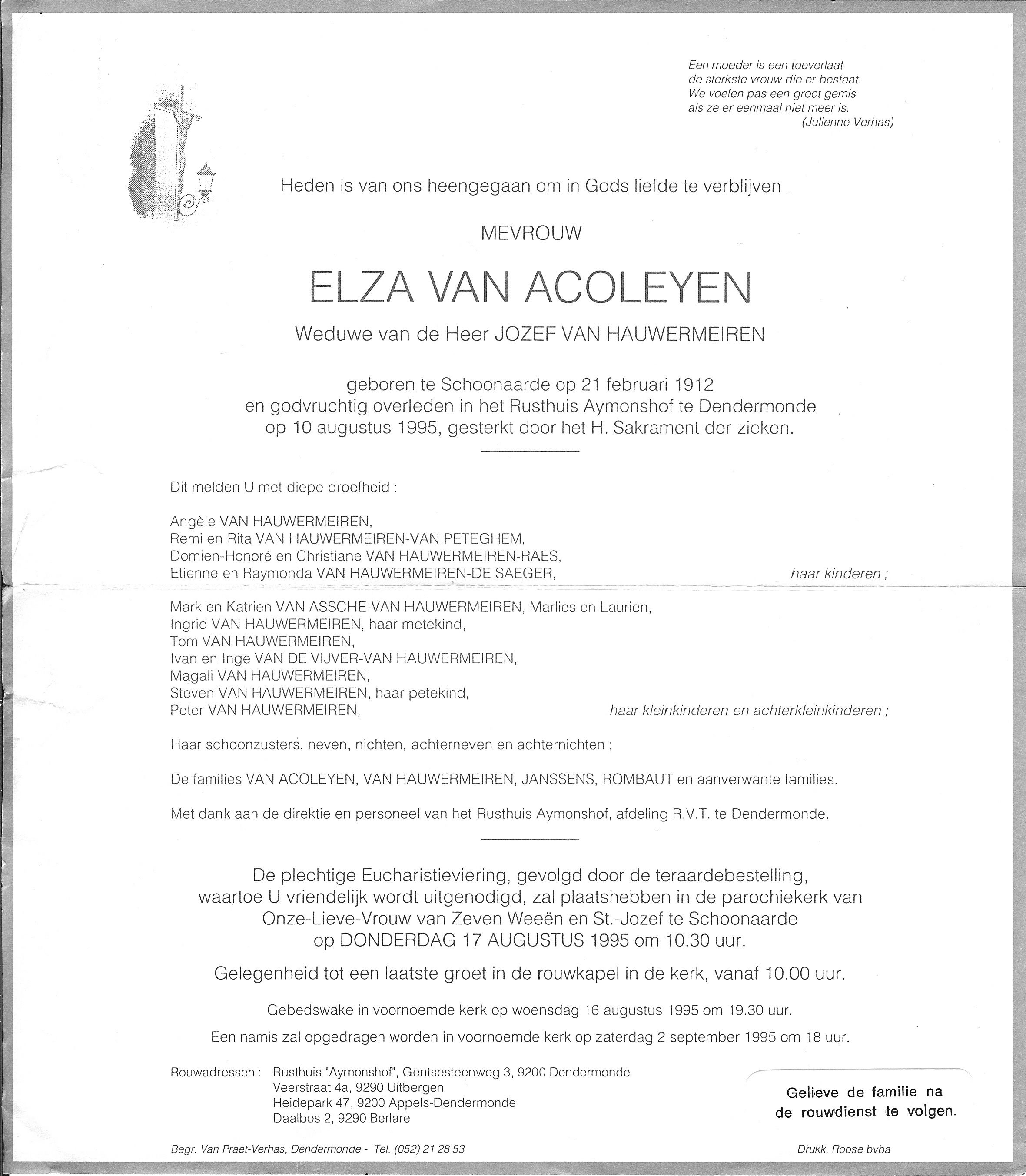 Overlijden van een dochter | Elza Van Acoleyen 10 augustus 1995 (Leeftijd 118 jaar) Adres: n.v.t.