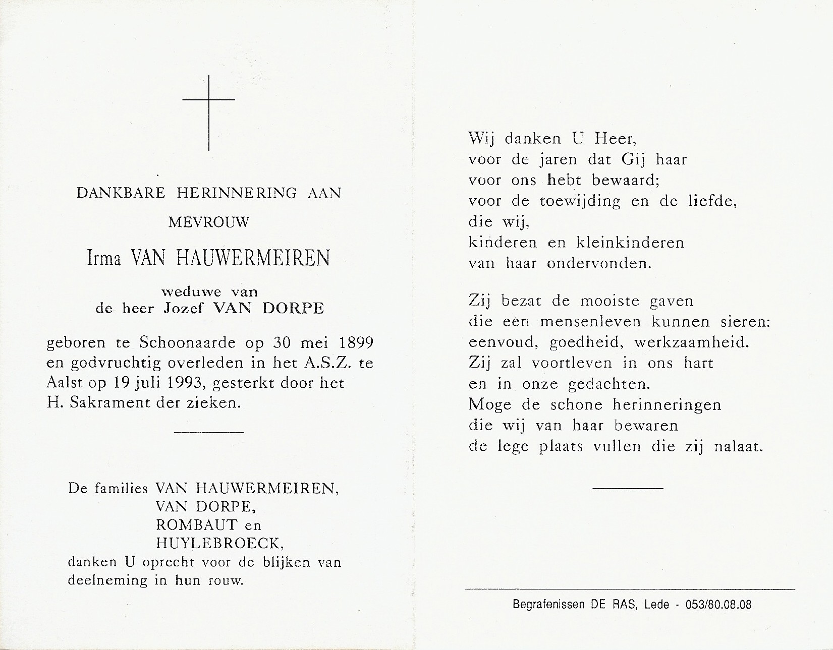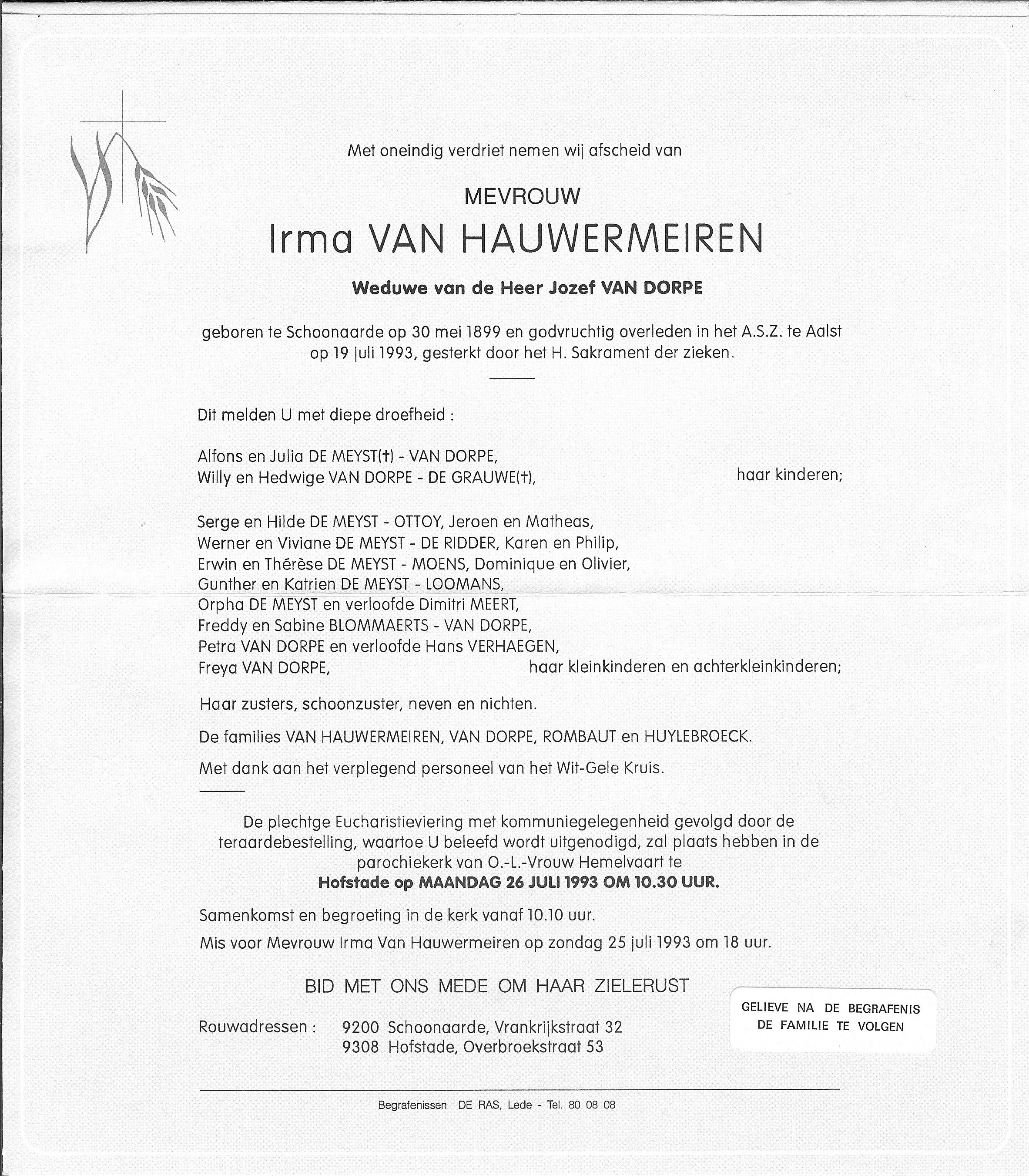 Overlijden van een zus | Irma Maria Van Hauwermeiren 19 juli 1993 (Leeftijd 87 jaar) Adres: n.v.t.