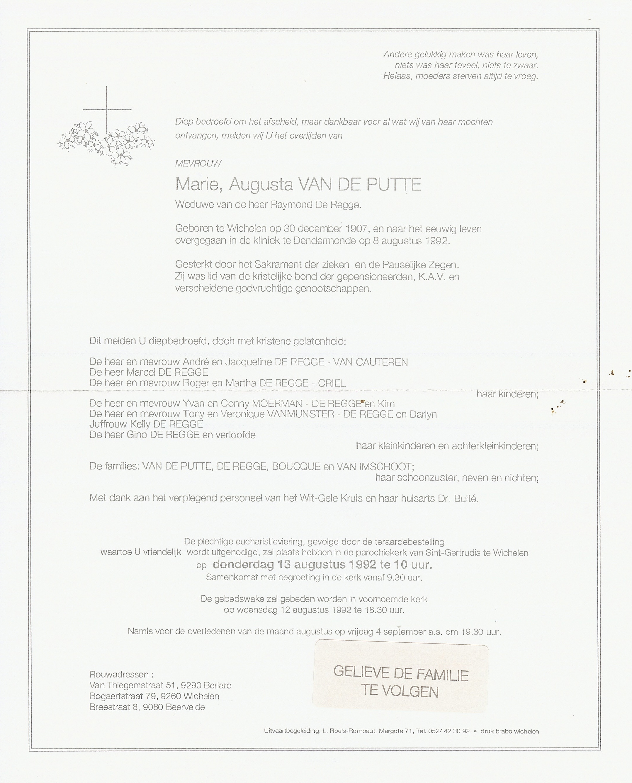 Begrafenis van moeder | Maria Augusta Van de Putte 13 augustus 1992 (Leeftijd 52 jaar) |