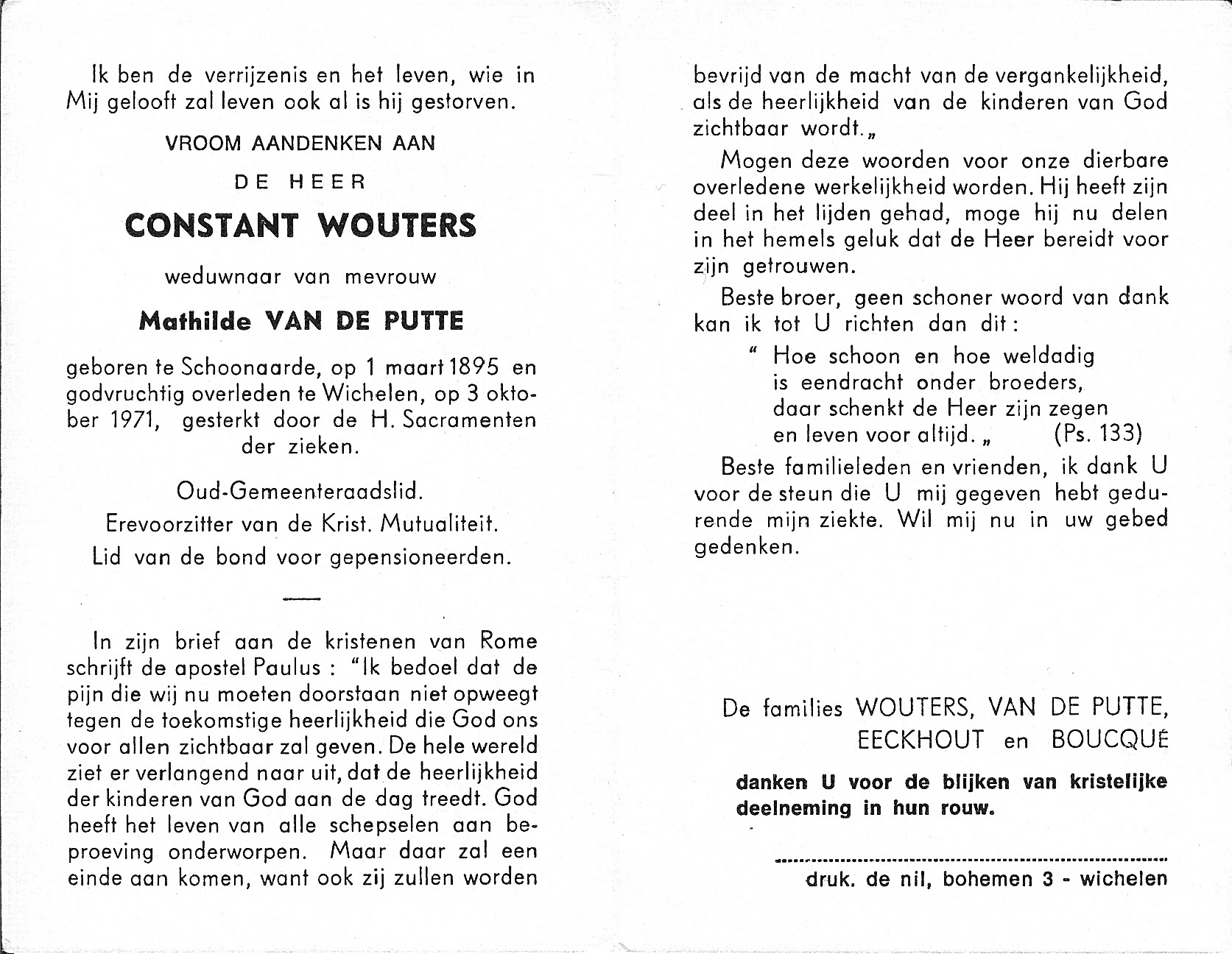 Constant Wouters Geboren: 1 maart 1895 — Schoonaarde Overleden: 3 oktober 1971 — Wichelen |