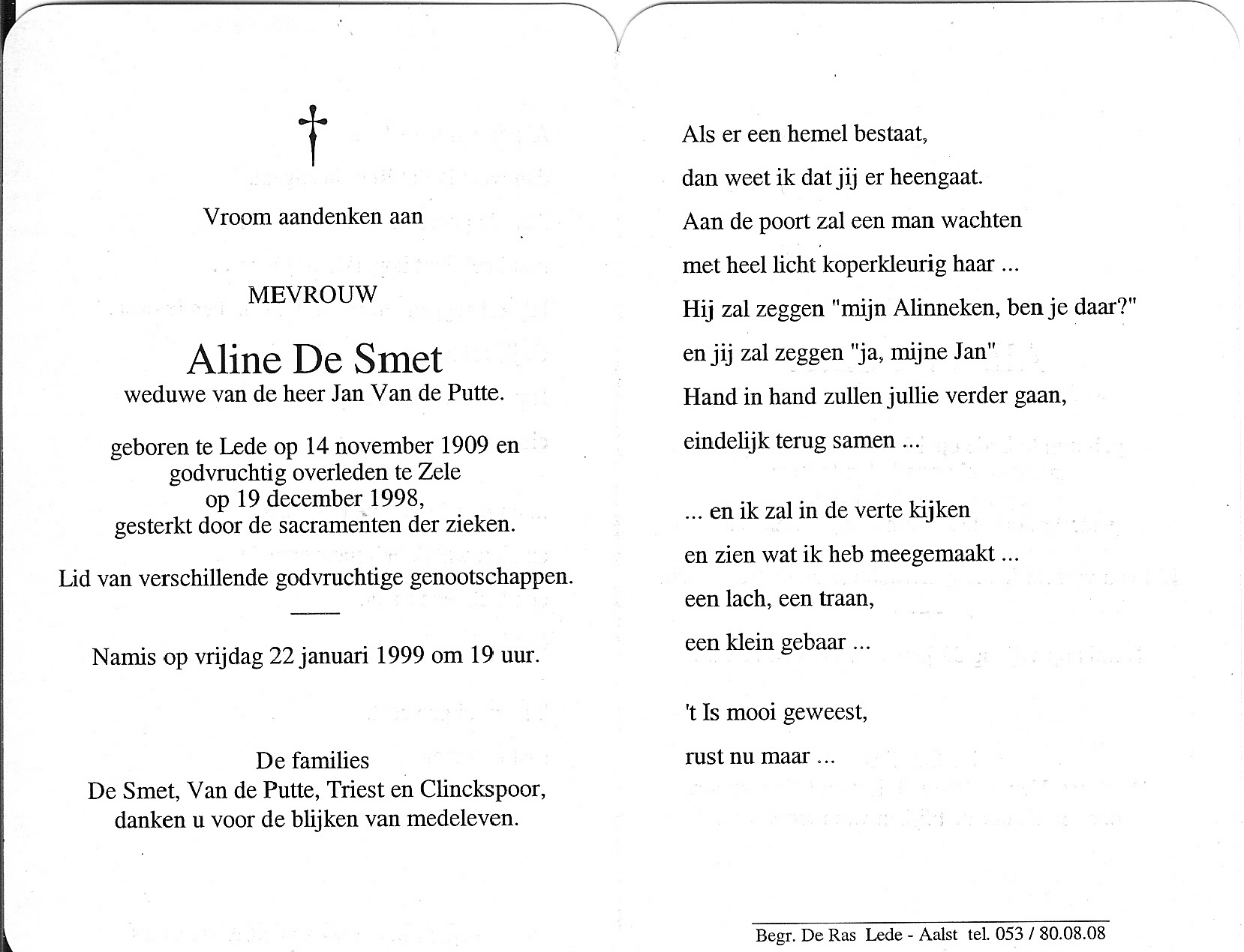 Overlijden van een echtgenoot | Joannes-Baptiste Van de Putte 11 december 1992 (Leeftijd 83 jaar) |