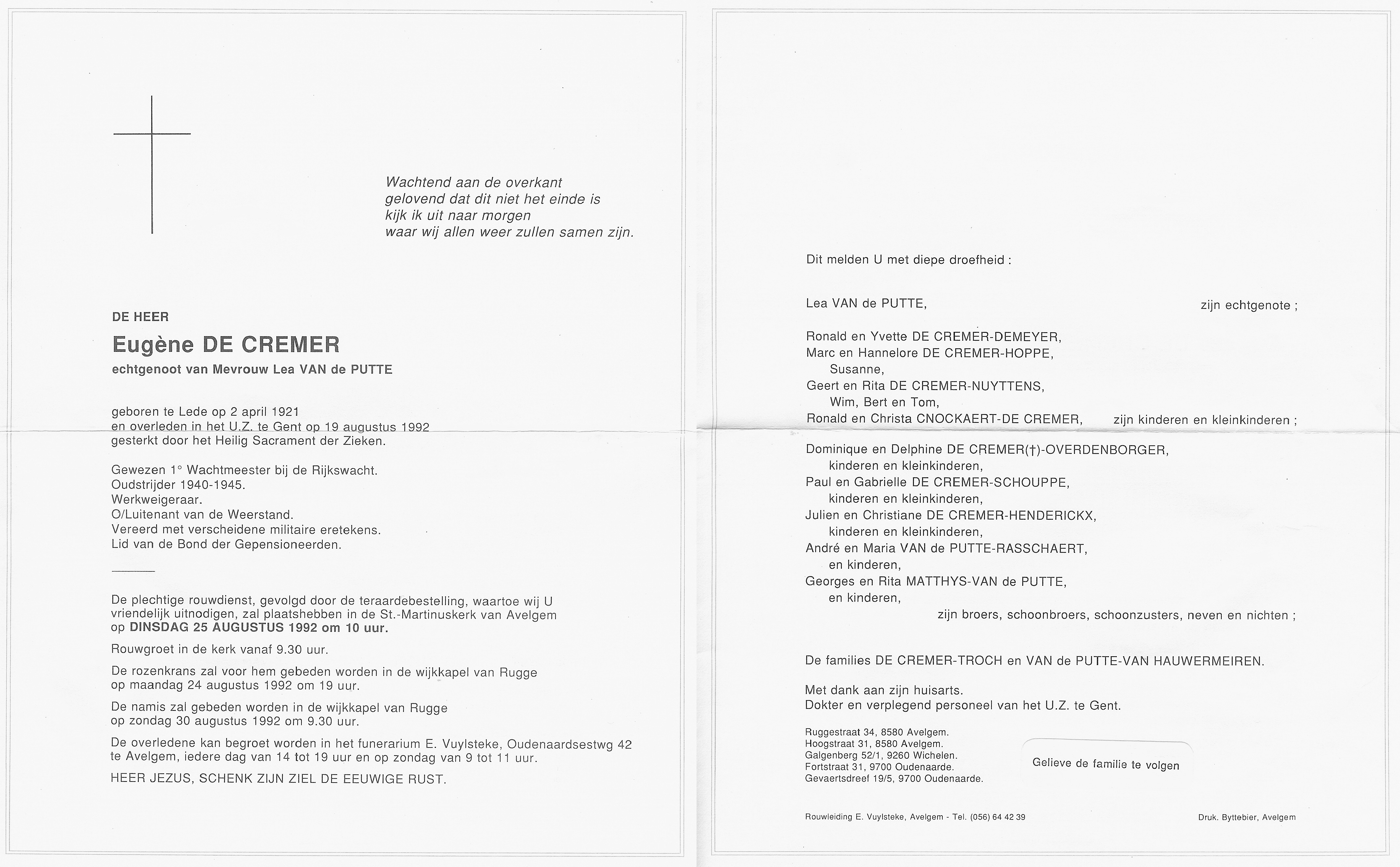 Begrafenis van grootvader van vaders kant | Eugène De Cremer 25 augustus 1992 (Leeftijd 15 jaar) |