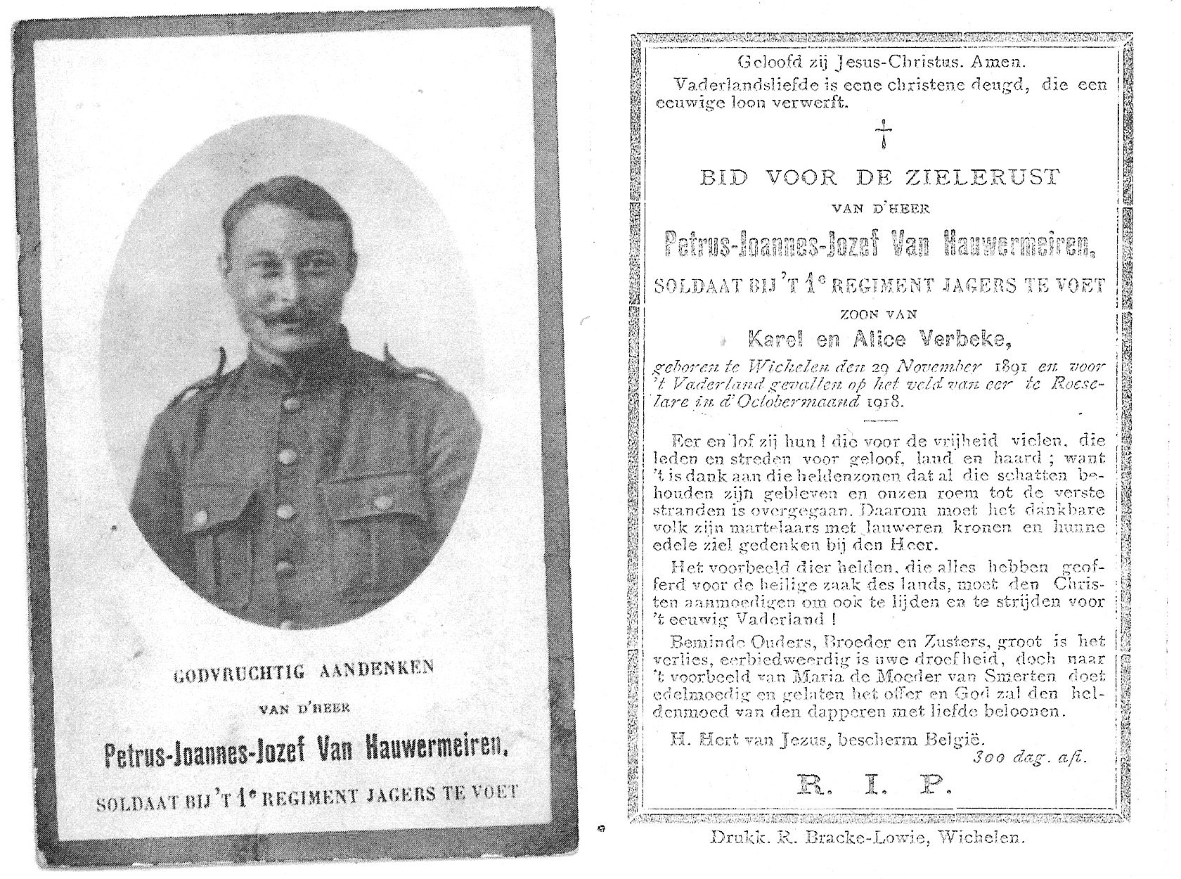 Overlijden van een broer | Petrus Joannes Josephus Van Hauwermeiren 3 oktober 1918 (Leeftijd 20 jaar) |