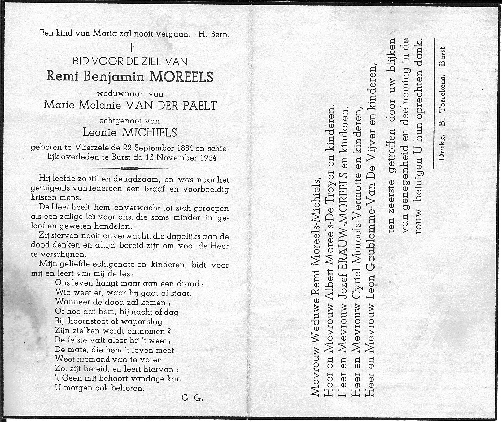 Remi Benjamin Moreels Geboren: 22 september 1884 29 39 — Vlierzele Overleden: 15 november 1954 — Burst |