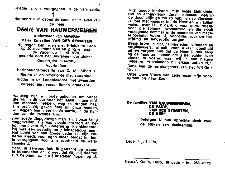 Desire Van Hauwermeiren Geboren: 20 november 1888 27 26 — Lede Overleden: 1 juli 1973 — Lede |