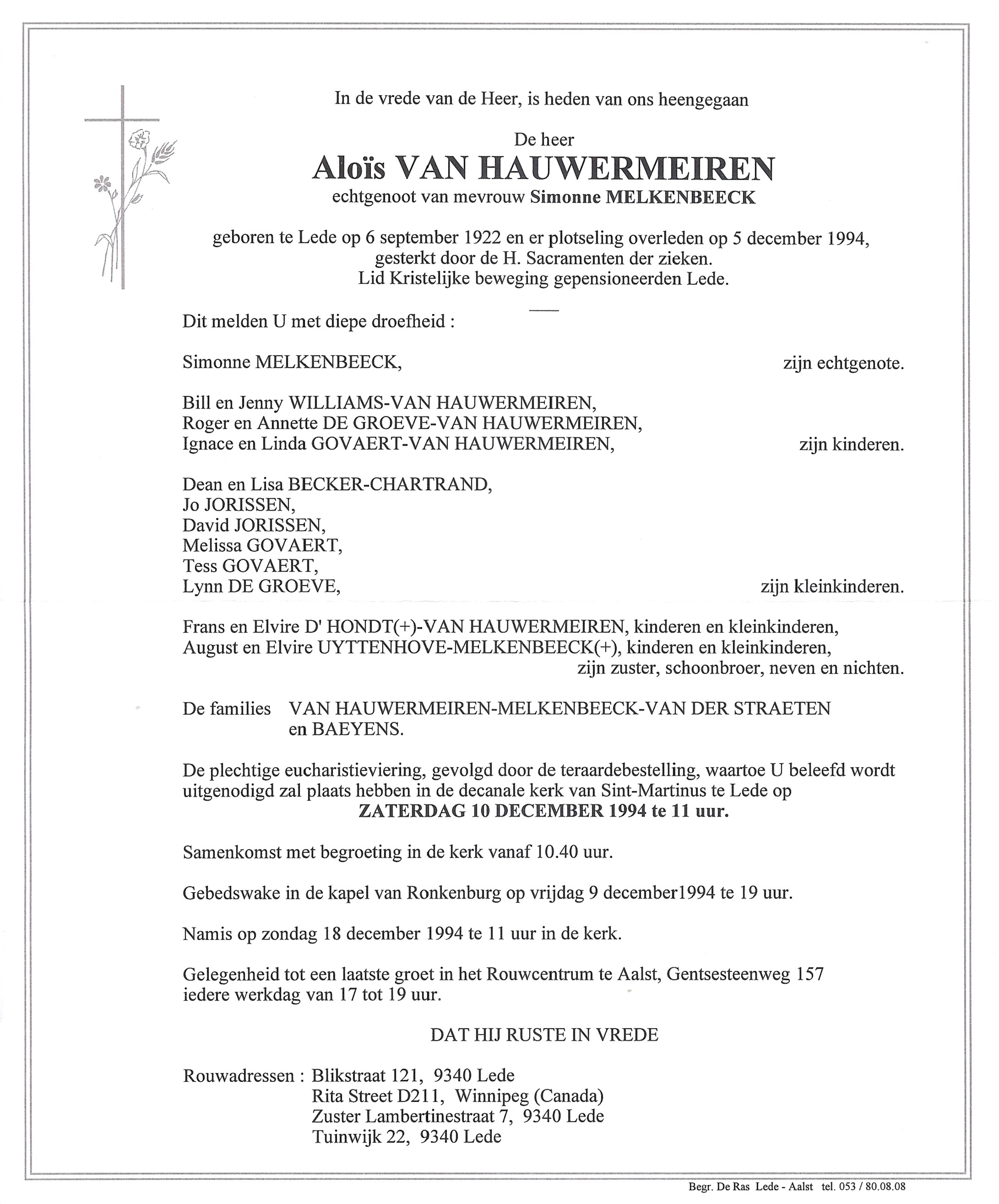 Elvire Van Hauwermeiren Geboren: 19 november 1920 31 26 — Lede Overleden: 20 april 2007 — Aalst |