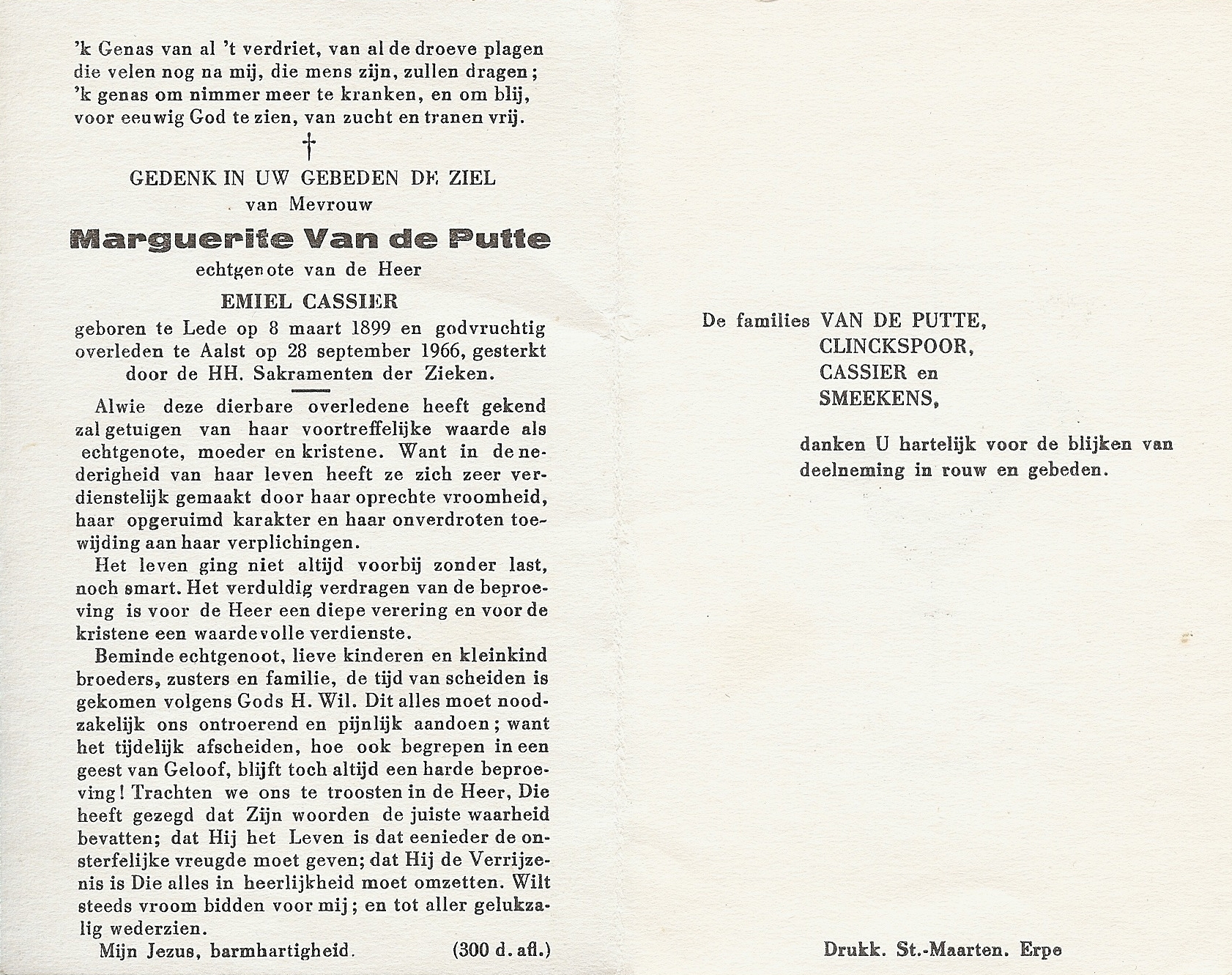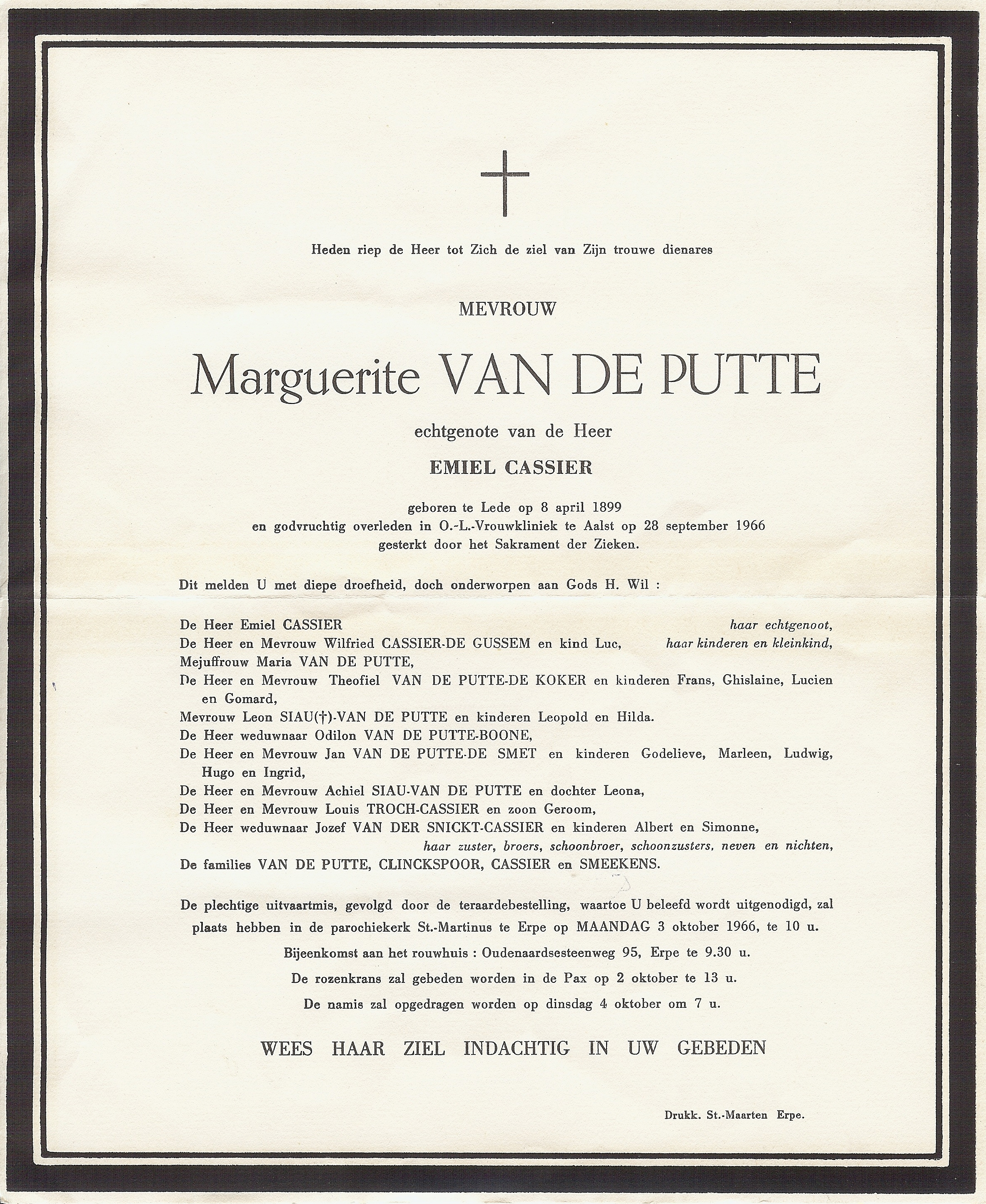 Begrafenis van een zus | Marguerite Octavia Van de Putte 3 oktober 1966 (Leeftijd 73 jaar) |
