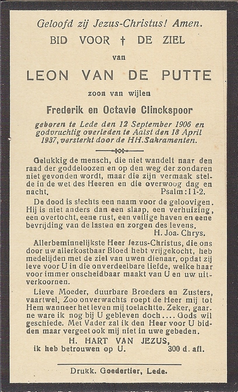 Overlijden van een broer | Petrus Leon Van de Putte 18 april 1937 (Leeftijd 43 jaar) |