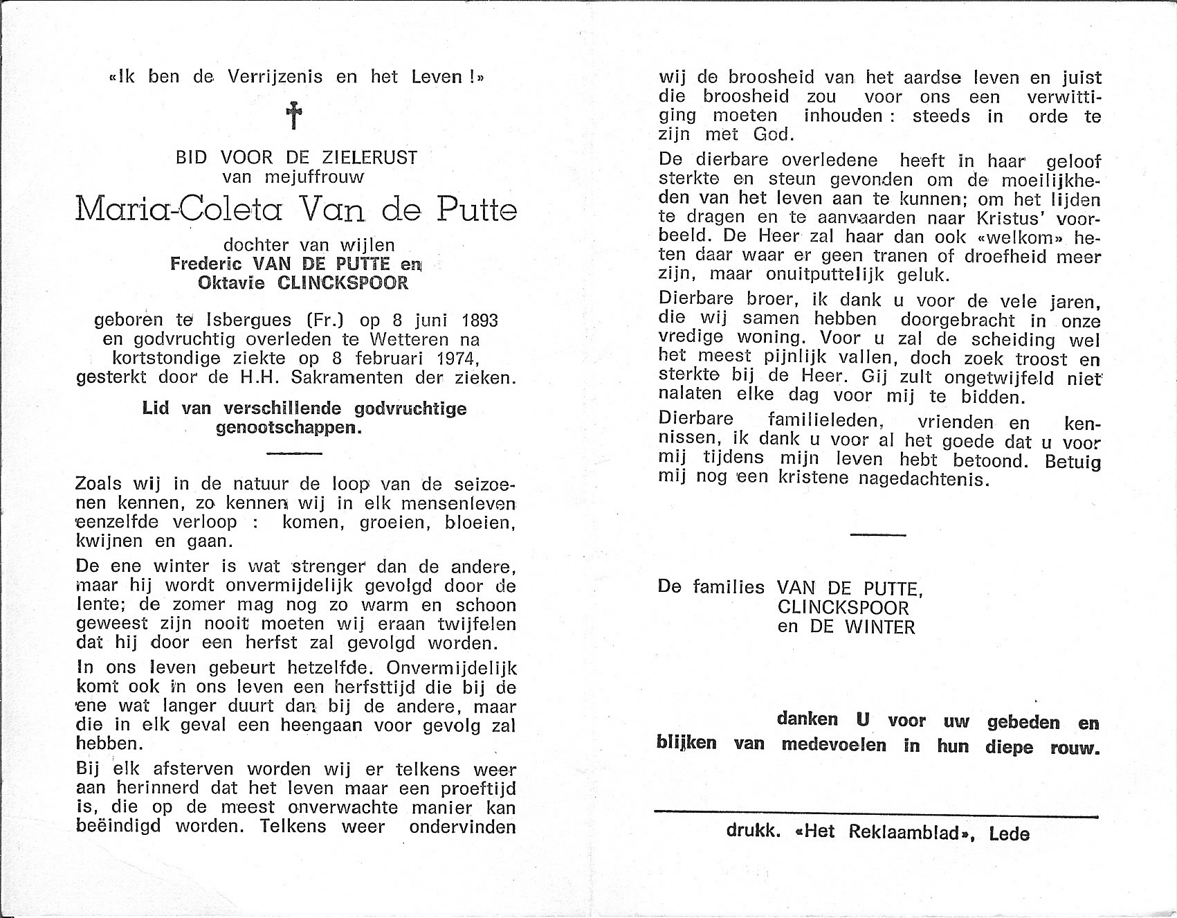 Maria-Coleta Van de PutteLeeftijd: 80 jaar1893–1974