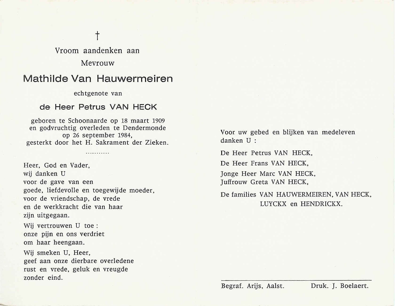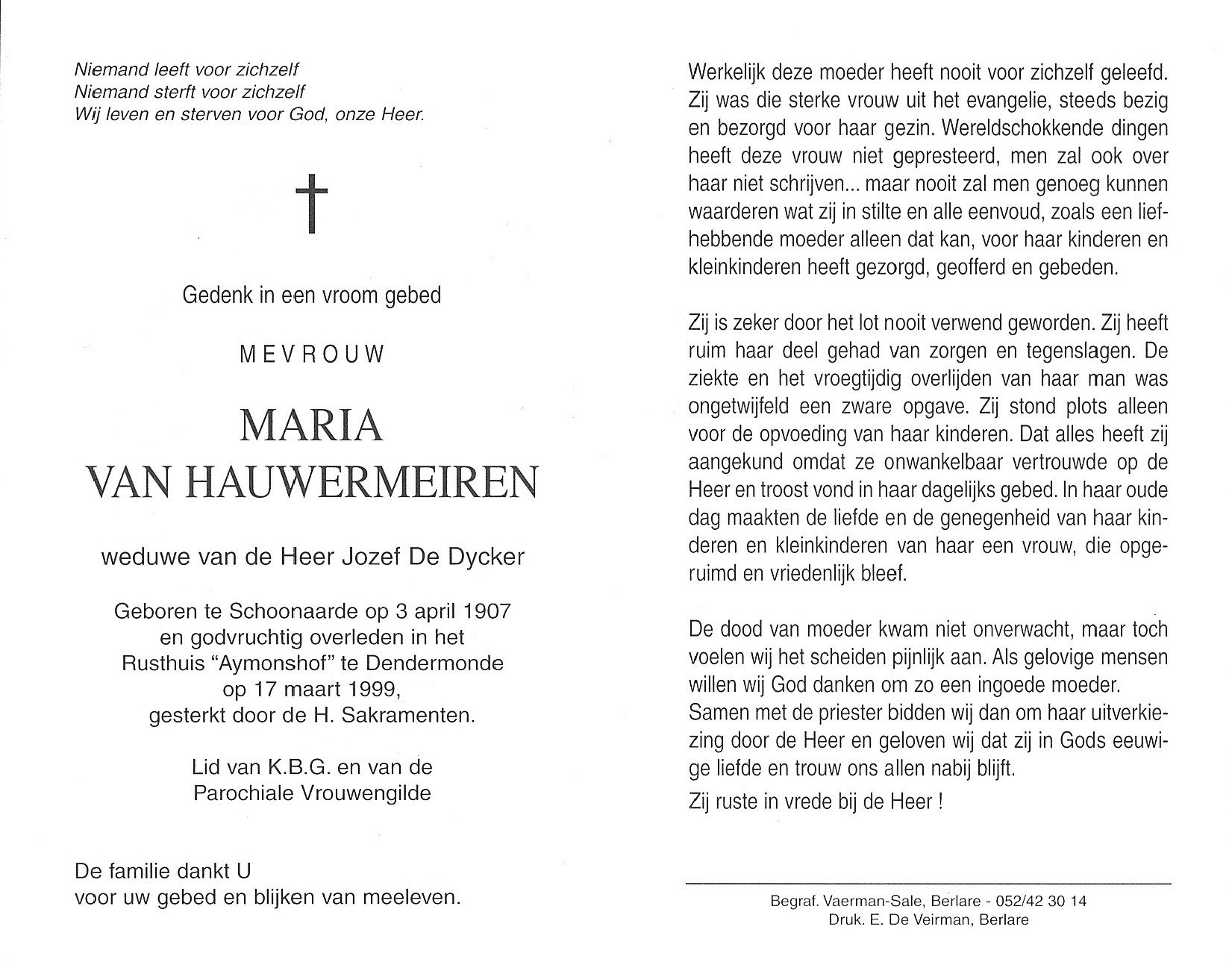 Mathilde Van Hauwermeiren Geboren: 18 maart 1909 36 36 — Schoonaarde Overleden: 26 september 1984 — Dendermonde |