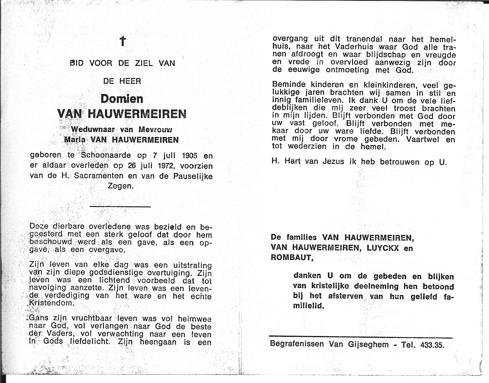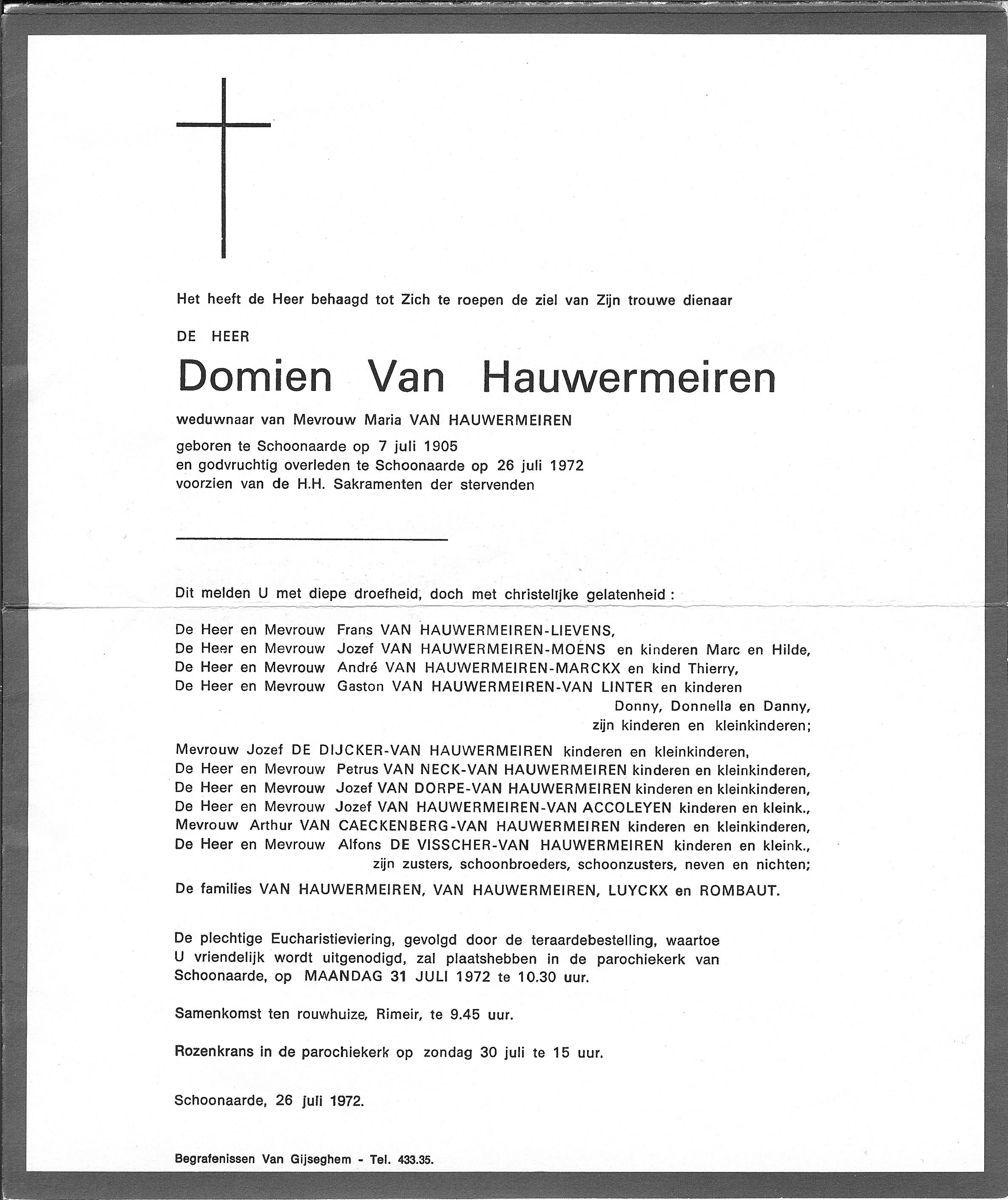Overlijden van een broer | Domien Van Hauwermeiren 26 juli 1972 (Leeftijd 65 jaar) |