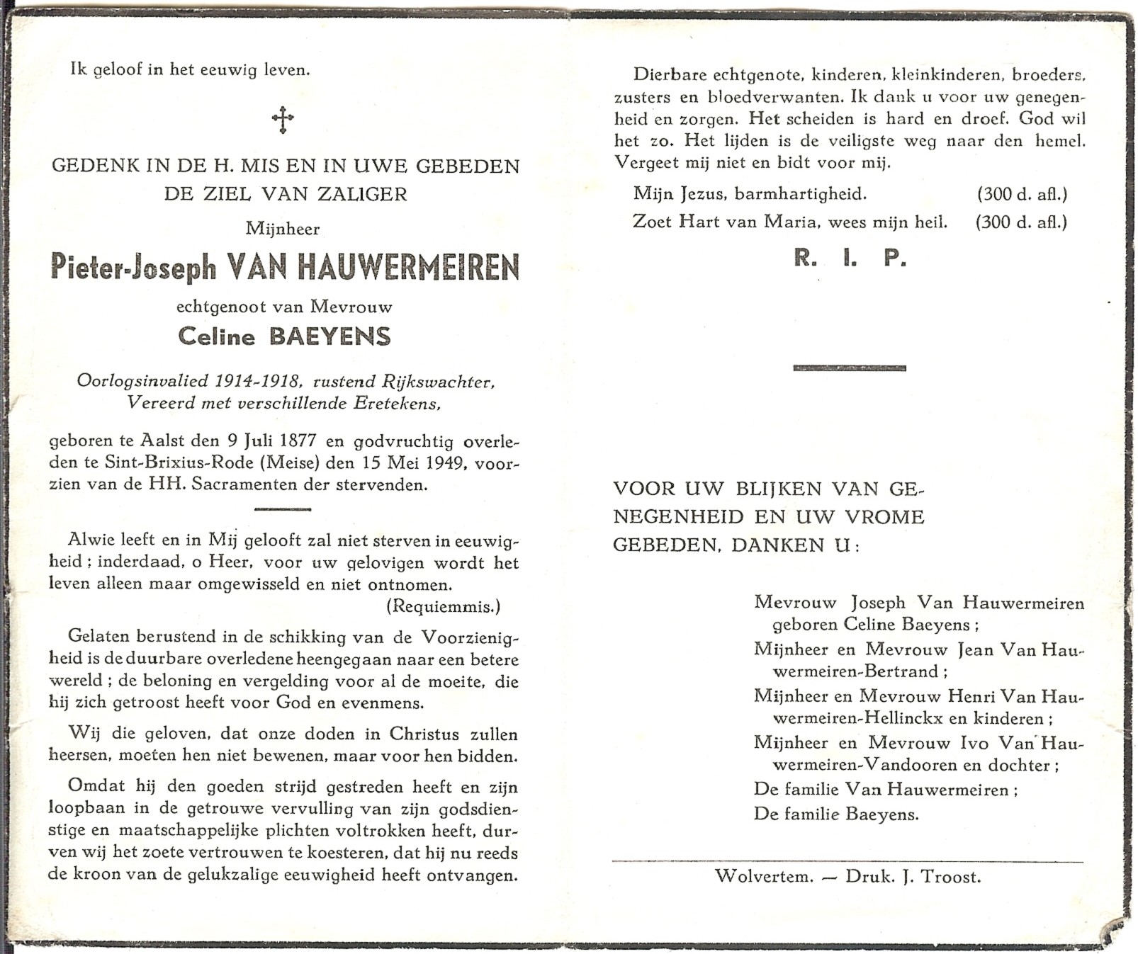 Petrus Josephus Van Hauwermeiren Geboren: 9 juli 1877 26 26 — Aalst Overleden: 15 mei 1949 — Sint-Brixius-Rode |