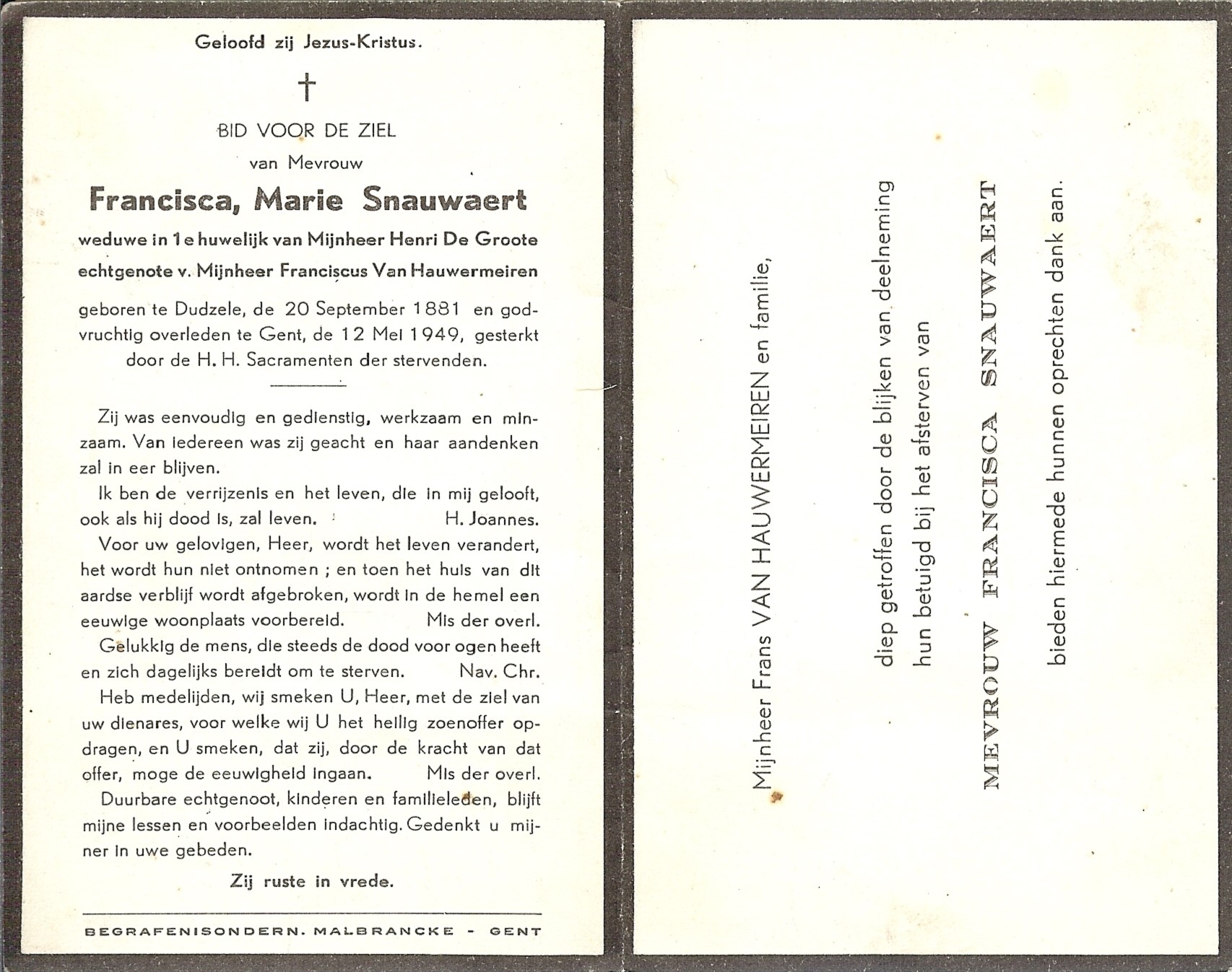 Francisca-Marie Snauwaert Geboren: 20 september 1881 — Dudzele Overleden: 12 mei 1949 — Gent |