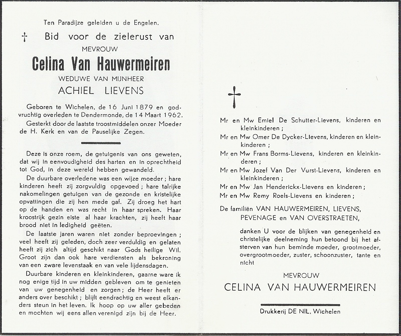 Maria Celina Van Hauwermeiren Geboren: 16 juni 1879 28 27 — Wichelen Overleden: 14 maart 1962 — Dendermonde |