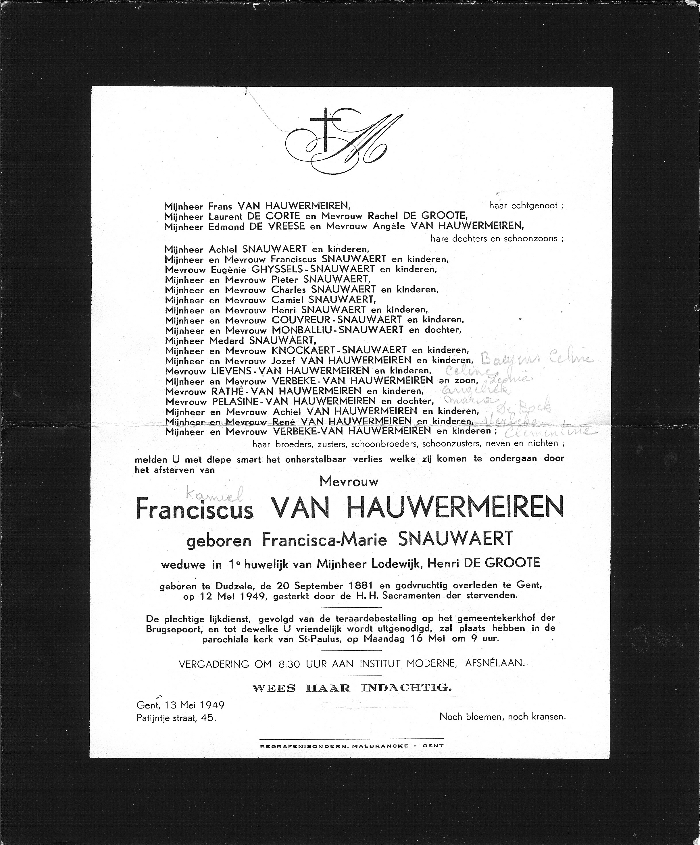 Overlijden van een halfbroer | Achiel Adolf Van Hauwermeiren 9 april 1959 (Leeftijd 75 jaar) |