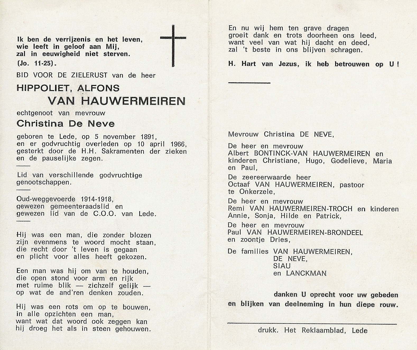 Hyppoliet Alfons Van Hauwermeiren Geboren: 5 november 1891 30 42 — Lede Overleden: 10 april 1966 — Lede |