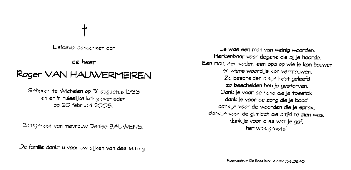 Roger Van Hauwermeiren Geboren: 31 augustus 1933 37 32 — Wichelen Overleden: 20 februari 2005 — Wichelen |