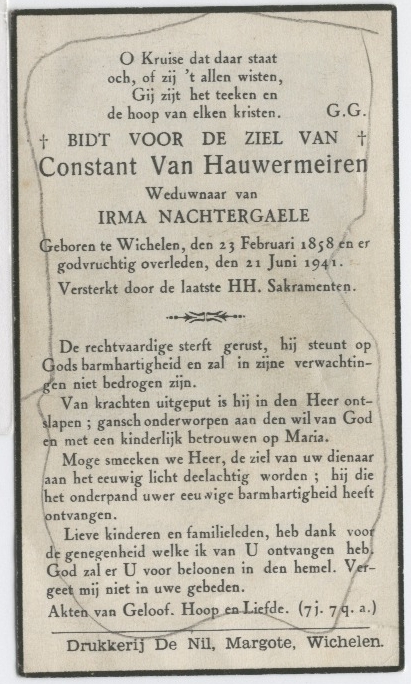Overlijden van grootvader van vaders kant | Constantinus Van Hauwermeiren 21 juni 1941 (Leeftijd 14 jaar) |