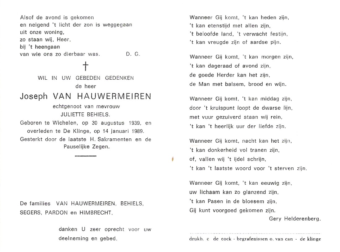 Overlijden van een echtgenoot | Joseph Van Hauwermeiren 14 januari 1989 (Leeftijd 55 jaar) |