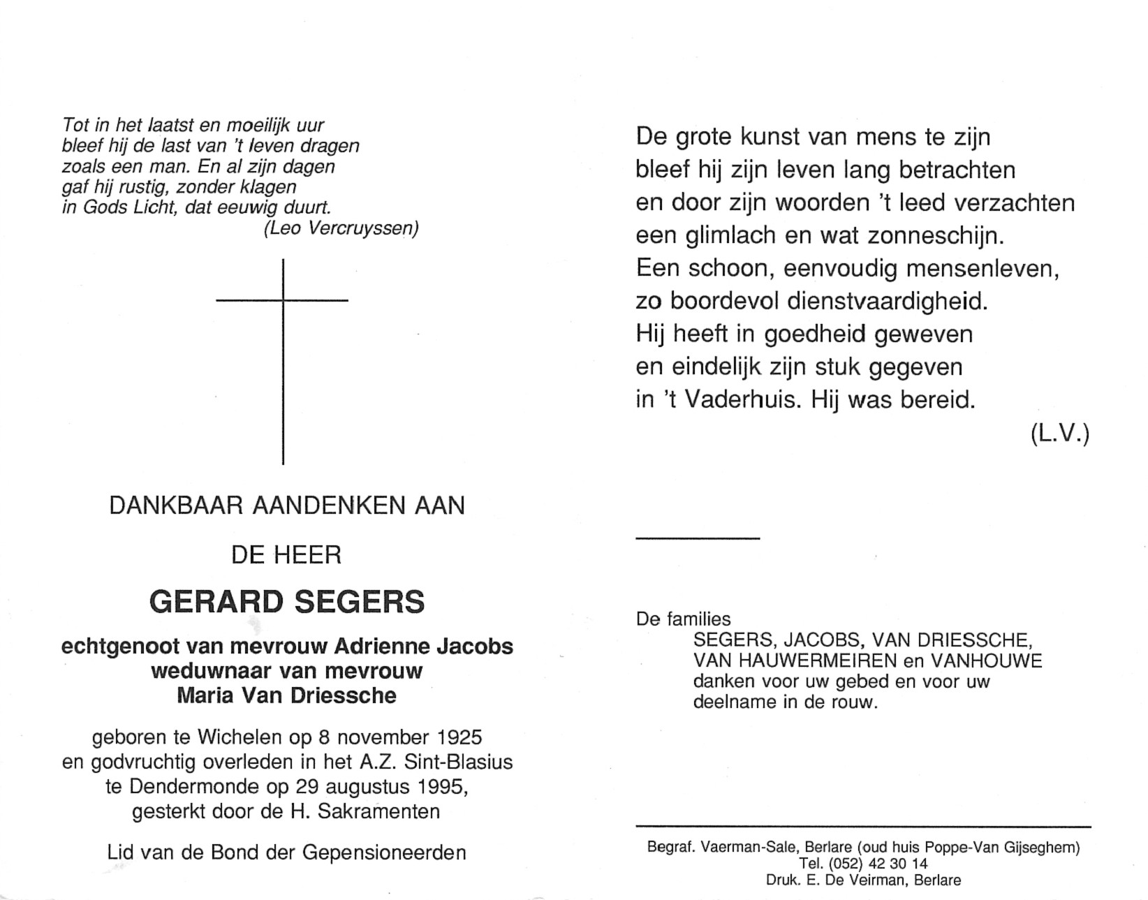 Gerard Segers Geboren: 8 november 1925 25 — Wichelen Overleden: 29 augustus 1995 — Dendermonde |