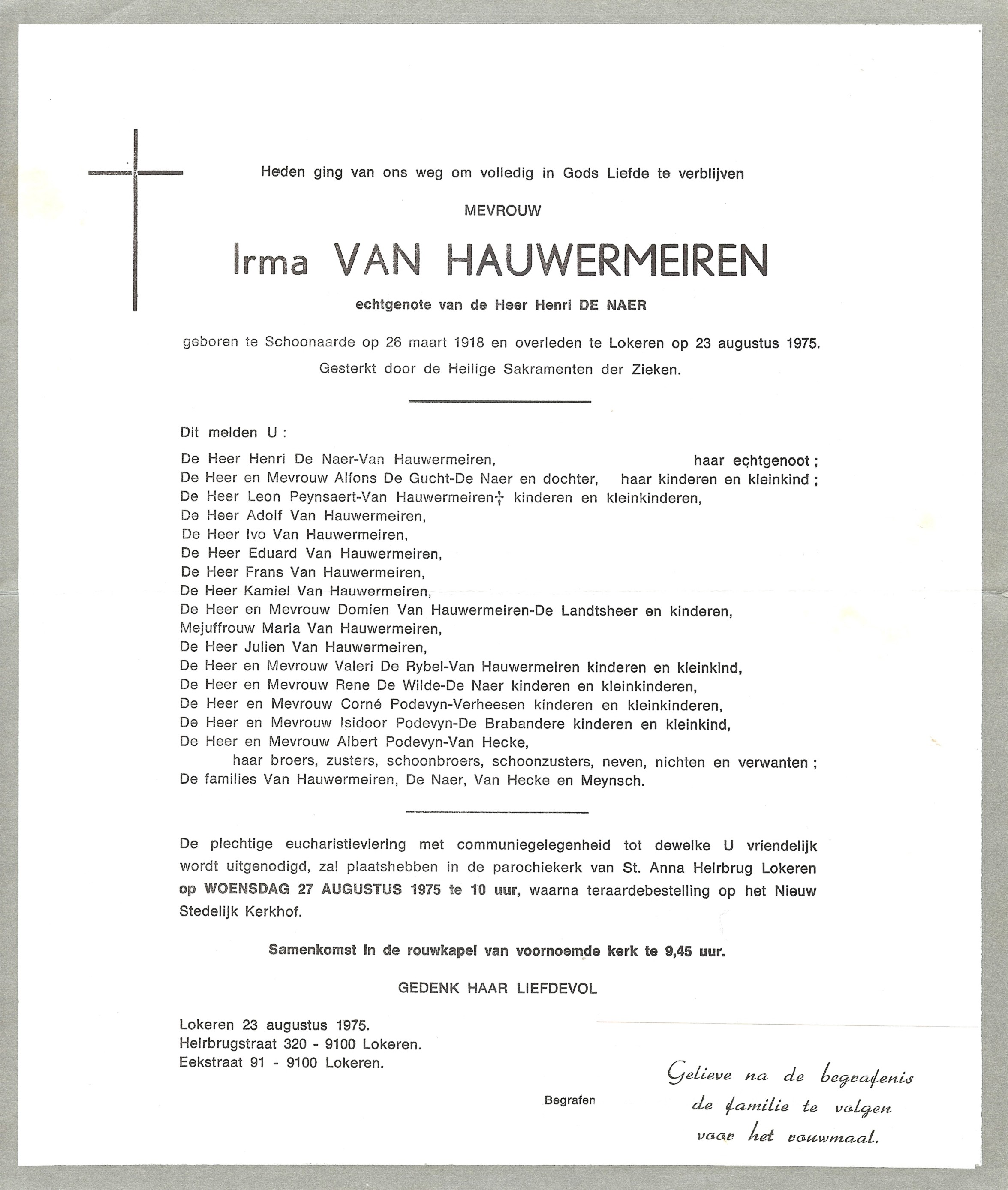Begrafenis van een zus | Irma Van Hauwermeiren 27 augustus 1975 (Leeftijd 55 jaar) |