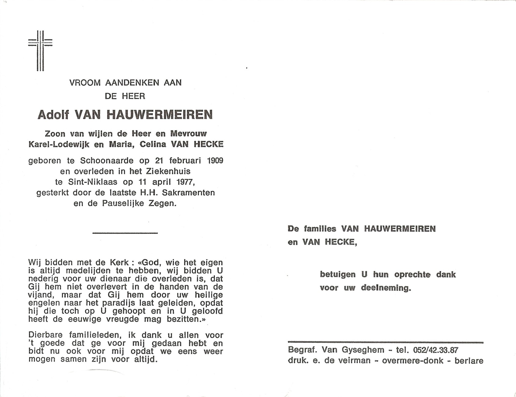 Adolf Van Hauwermeiren Geboren: 21 februari 1909 28 23 — Schoonaarde Overleden: 11 april 1977 — Sint-Niklaas |