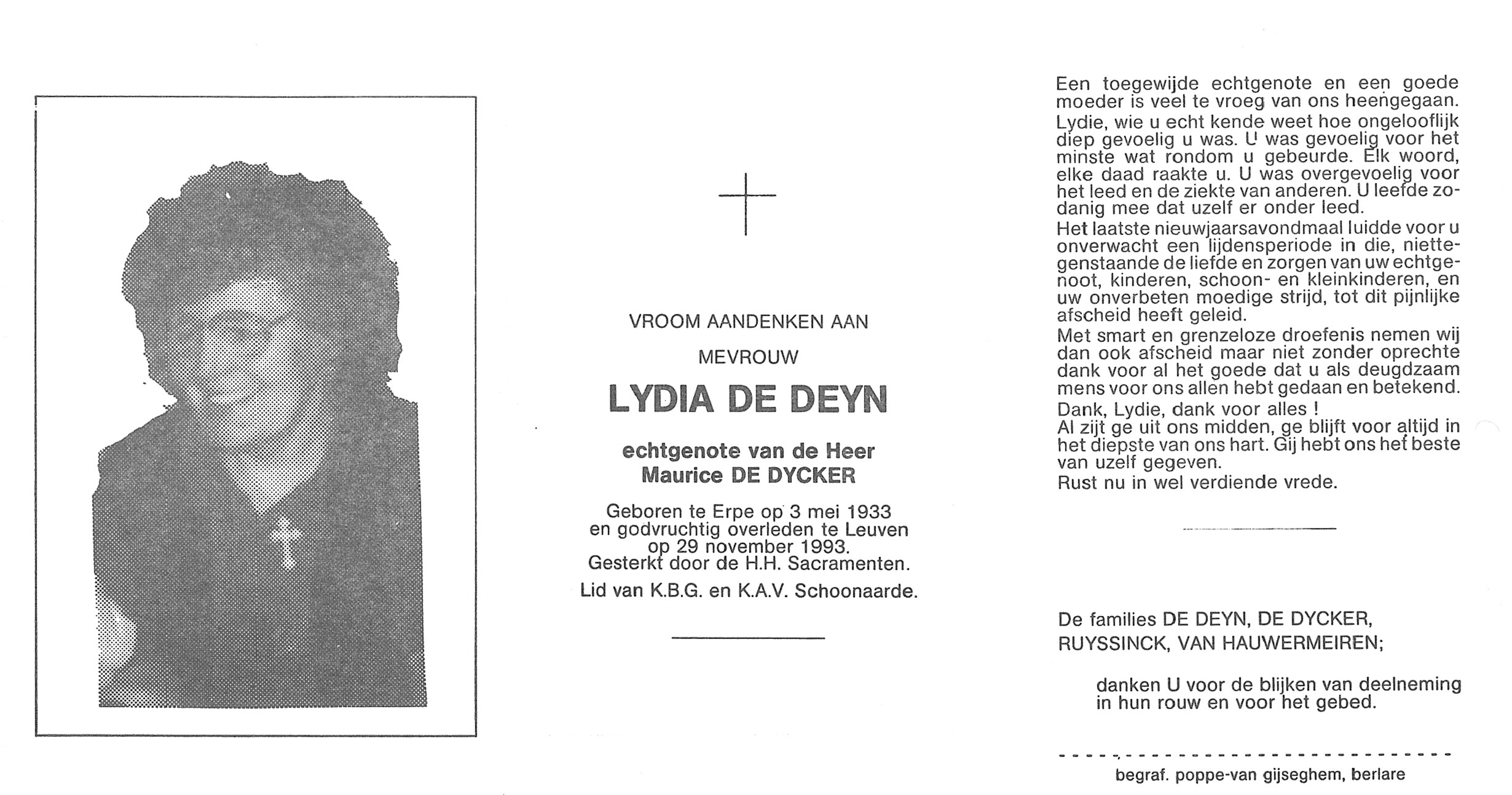 Lydie De Deyn Geboren: 3 mei 1933 — Erpe Overleden: 29 november 1993 — Leuven |