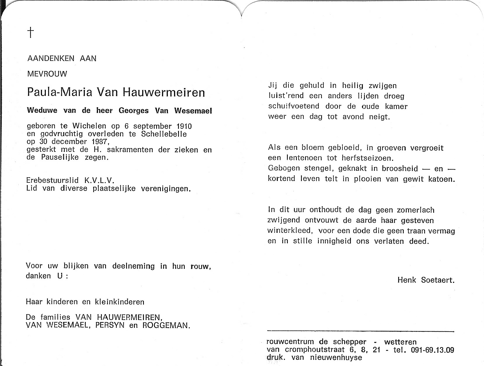 Paula Maria Frederica Van Hauwermeiren Geboren: 6 september 1910 32 23 — Wichelen Overleden: 30 december 1987 — Schellebelle |