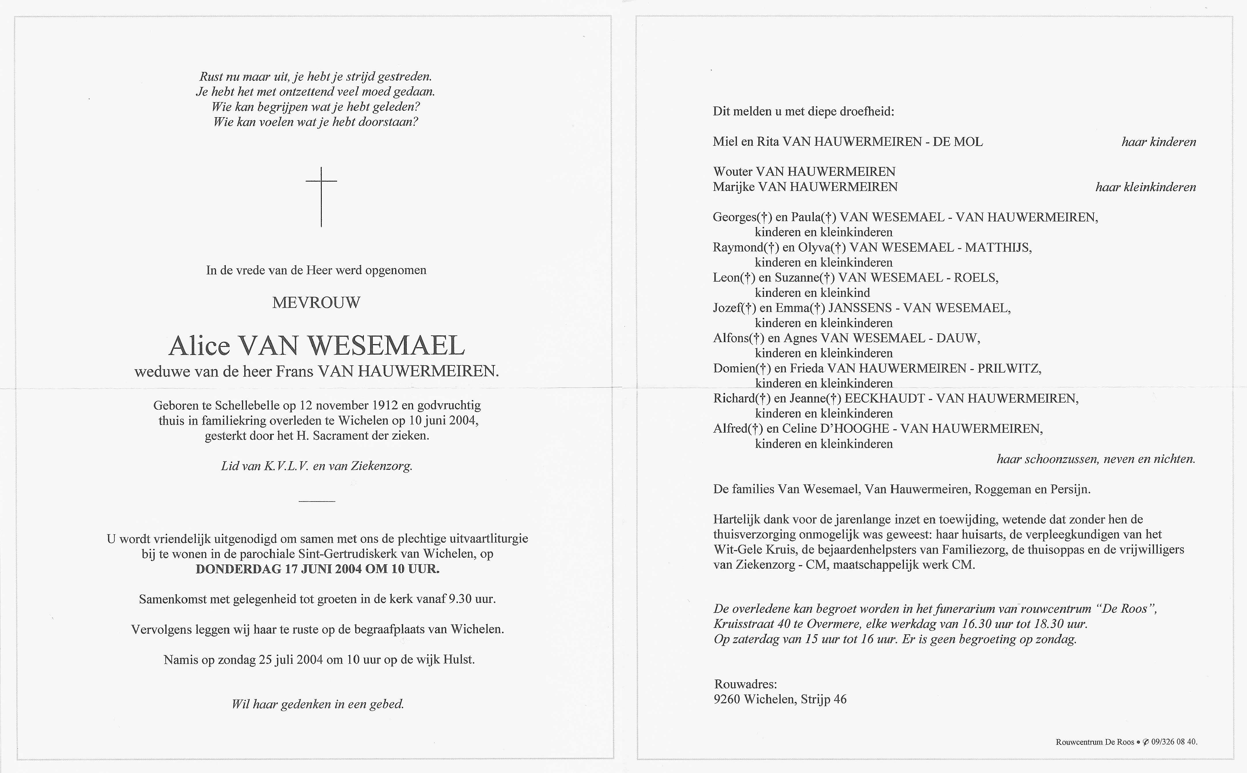 Alice Palmyre Van Wesemael Geboren: 12 november 1912 38 44 — Schellebelle Overleden: 10 juni 2004 — Wichelen |